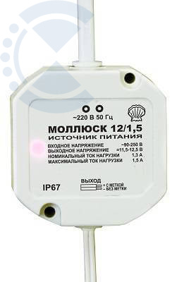Источник питания Моллюск 12/1,5 предназначен для питания радиоэлектронных устройств широкого применения напряжением 12 В постоянного тока. Блок питания защищён от перегрузки и короткого замыкания на выходе, работоспособен на холостом ходу. Блок питания применяется для скрытой установки в: кабельные каналы; электротехнические распаечные (соединительные) коробки; кожух видеокамеры.
