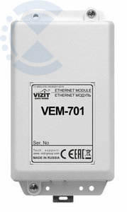 VIZIT Ethernet Модуль VEM-701 предназначен для использования совместно с блоками управления БУД-485М,(-485МР), КТМ685(685Р, 608Р) для удалённого администрирования установок, базы ключей и индивидуальных кодов блоков управления, а также обновления ПО блоков через Интернет. Администрирование осуществляется с автоматизированного рабочего места (АРМ).