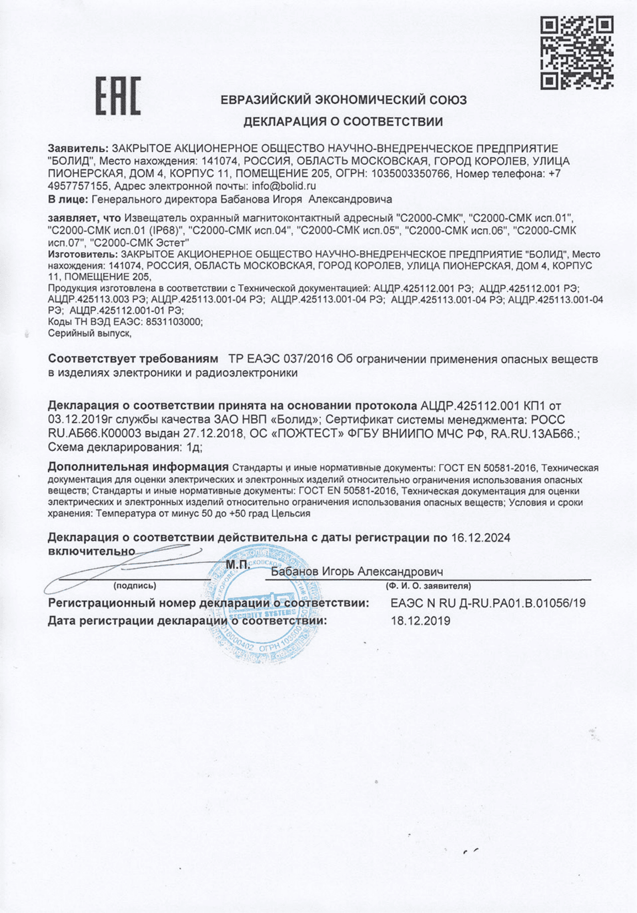 Магнитоконтактный адресный, питание по двухпроводной линии от С2000-КДЛ, степень защиты оболочкой IP68, tраб.-45...+55°С, 56х10х8мм, длина соед.провод.1,5м