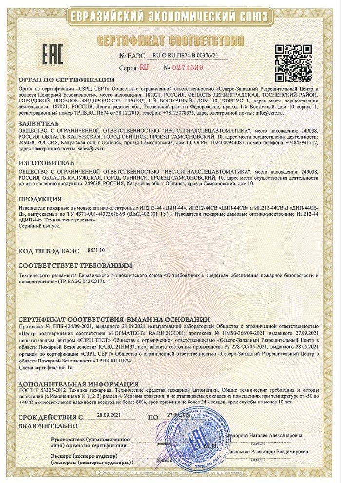 Извещатели ИП212-44 являются базовой модификацией этого типа извещателей и в режиме «Пожар» формируют унифицированный сигнал срабатывания в виде уменьшения внутреннего сопротивления до величины не более 500 Ом при токе 20 мА. В выходных цепях извещателей традиционно отсутствует ограничитель тока, так как они предназначены для использования с ППК, имеющими собственный ограничитель тока в схеме питания шлейфа. Остаточное напряжение на извещателе при срабатывании составляет от 7,5 до 8,5 В при токах от 5 до 20 мА. При переходе на технологию SMD-монтажа в выходные цепи извещателей была введена стабилитронная защита оптического индикатора, что позволило увеличить максимально-допустимый ток в режиме срабатывания с 20 до 50 мА.