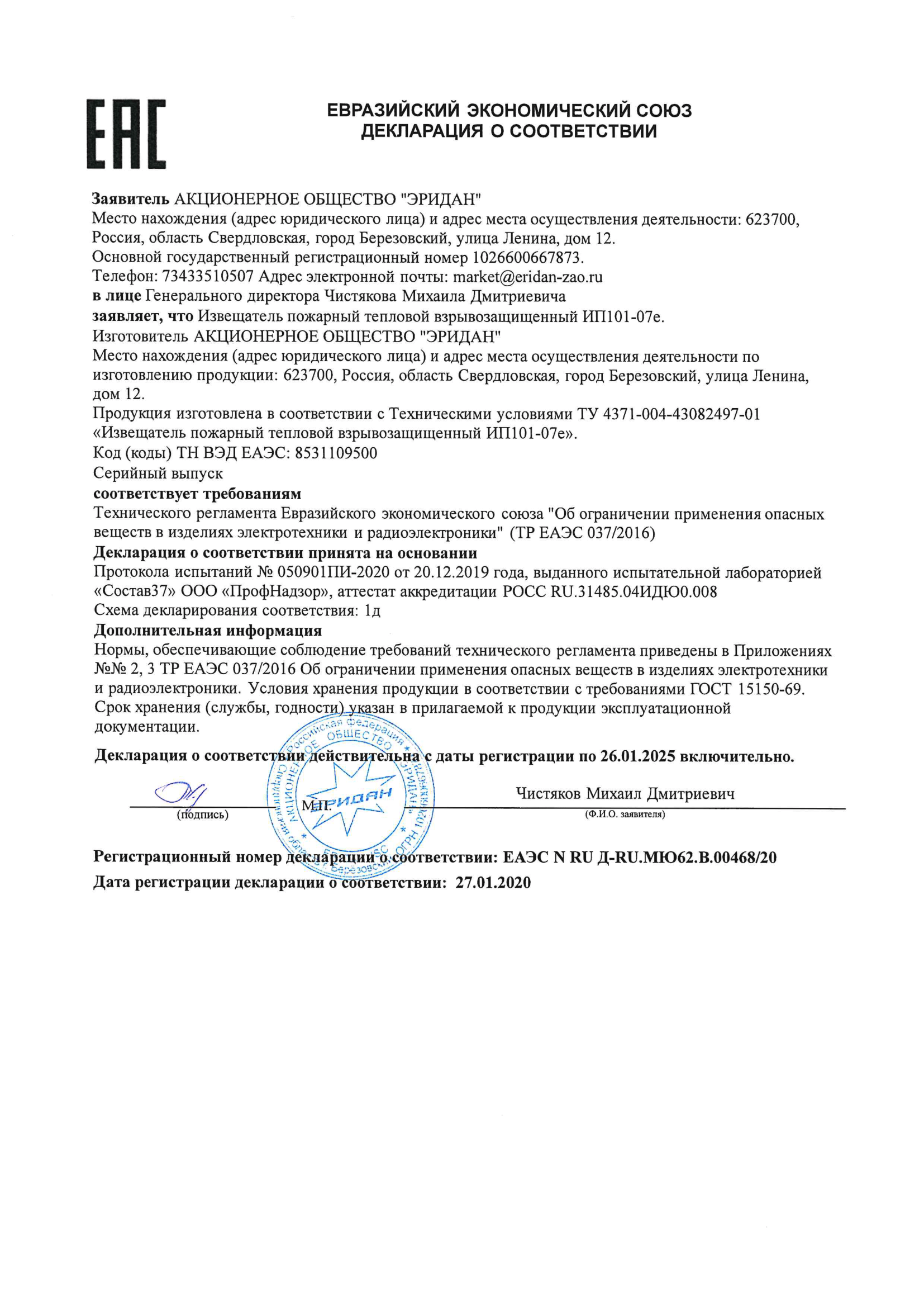 Извещатель ИП 101-07е (КВМ15+ЗГ) В (69-85 °С) тепловой взрывозащищенный Эридан в Перми