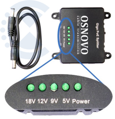 PoE-сплиттер Gigabit Ethernet с функцией выбора напряжения на 5/9/12/18V. Соответствует стандартам PoE IEEE 802.3af/at. Предназначен для питания оконечных сетевых устройств, не поддерживающих PoE. Рабочая температура 0 ... +40°C.