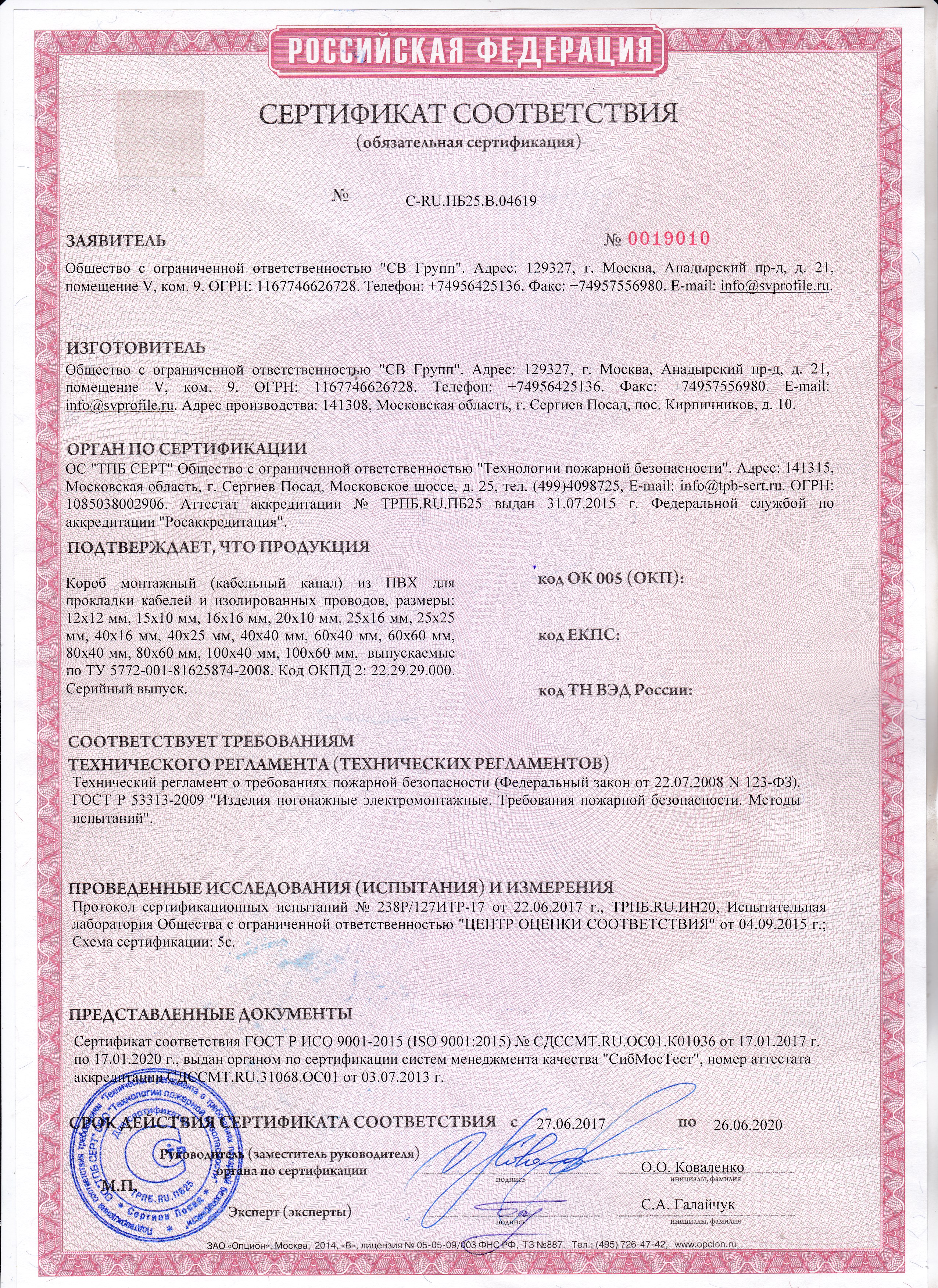 Электротехнические короба DeGross, по результатам испытаний по НПБ 246-97, ГОСТ 27483-87 на стойкость к воздействию нагретой проволокой, открытым пламенем на стойкость к распространению горения, относится к группе самогасящихся, не капающих при воздействии огнем материалов и соответствует требованиям по трудновоспламеняемости.