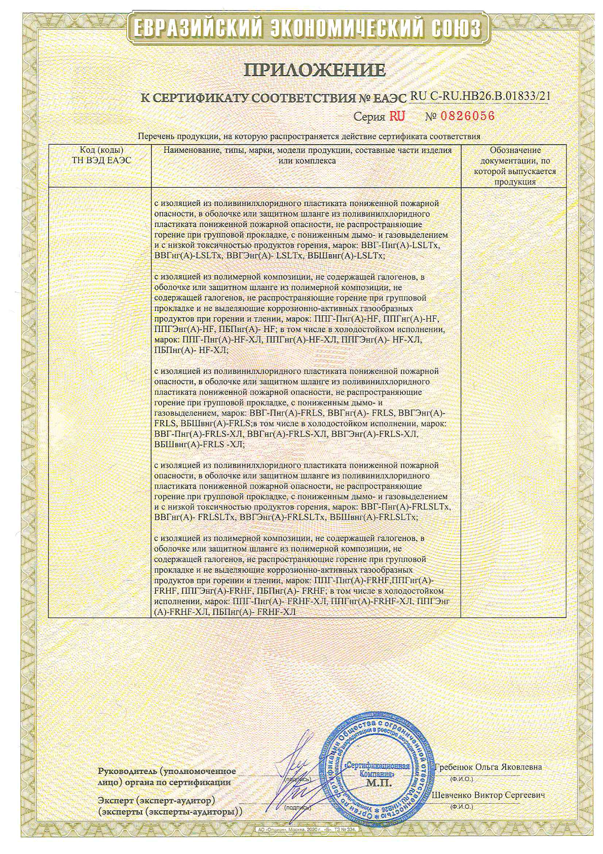 Кабель с медными однопроволочными токопроводящими жилами, с термическим барьером в виде двух слюдосодержащих лент, с изоляцией и оболочками (внутренней и наружной) из ПВХ-композиции пониженной пожароопасности с низким дымогазовыделением. Предназначен для передачи и распределения электроэнергии в стационарных установках.