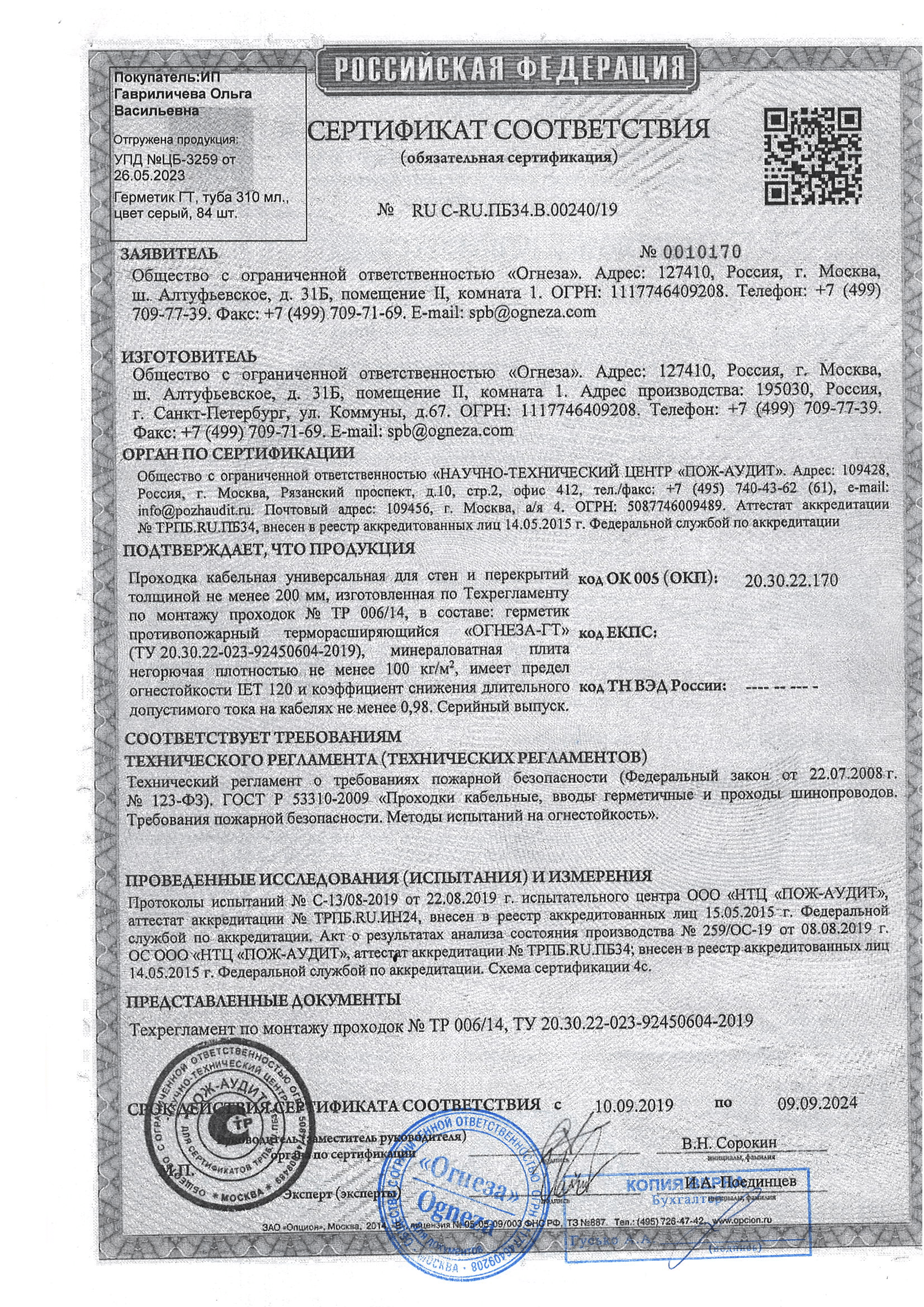 герметик ОГНЕЗА ГТ, 310 мл 105038 применяется для нанесения при монтаже кабельных проходок, для герметизации строительных швов.