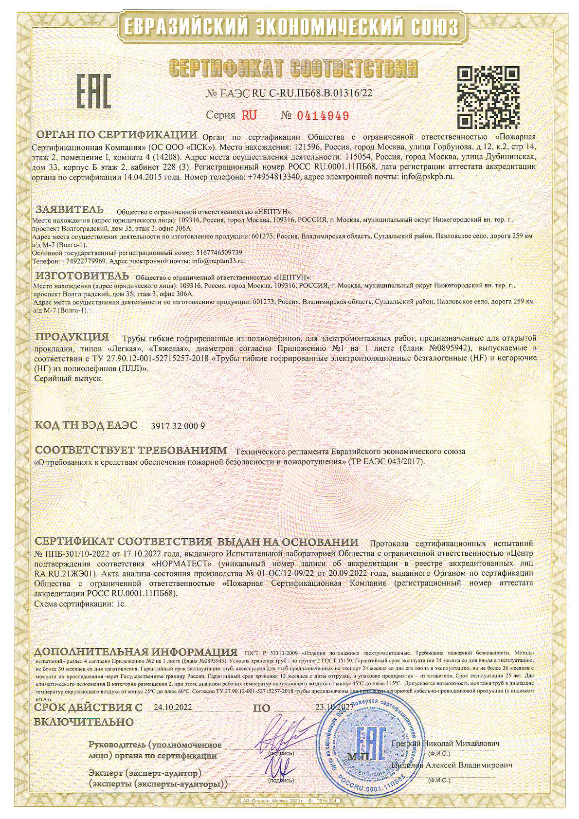 Гофрированная труба из полиолефинов – это универсальное средство для защиты изолированных проводов и кабелей при прокладке сложных систем и трасс в общественных помещениях с большим скоплением людей. Применяется для скрытой и открытой прокладки в несущих и ограждающих конструкциях из сгораемых/несгораемых материалов жилых, административных и производственных зданий и сооружений. Труба соответствует категории горения ПВ-0 и одновременно с этим не выделяет вредных для здоровья веществ (галогены).