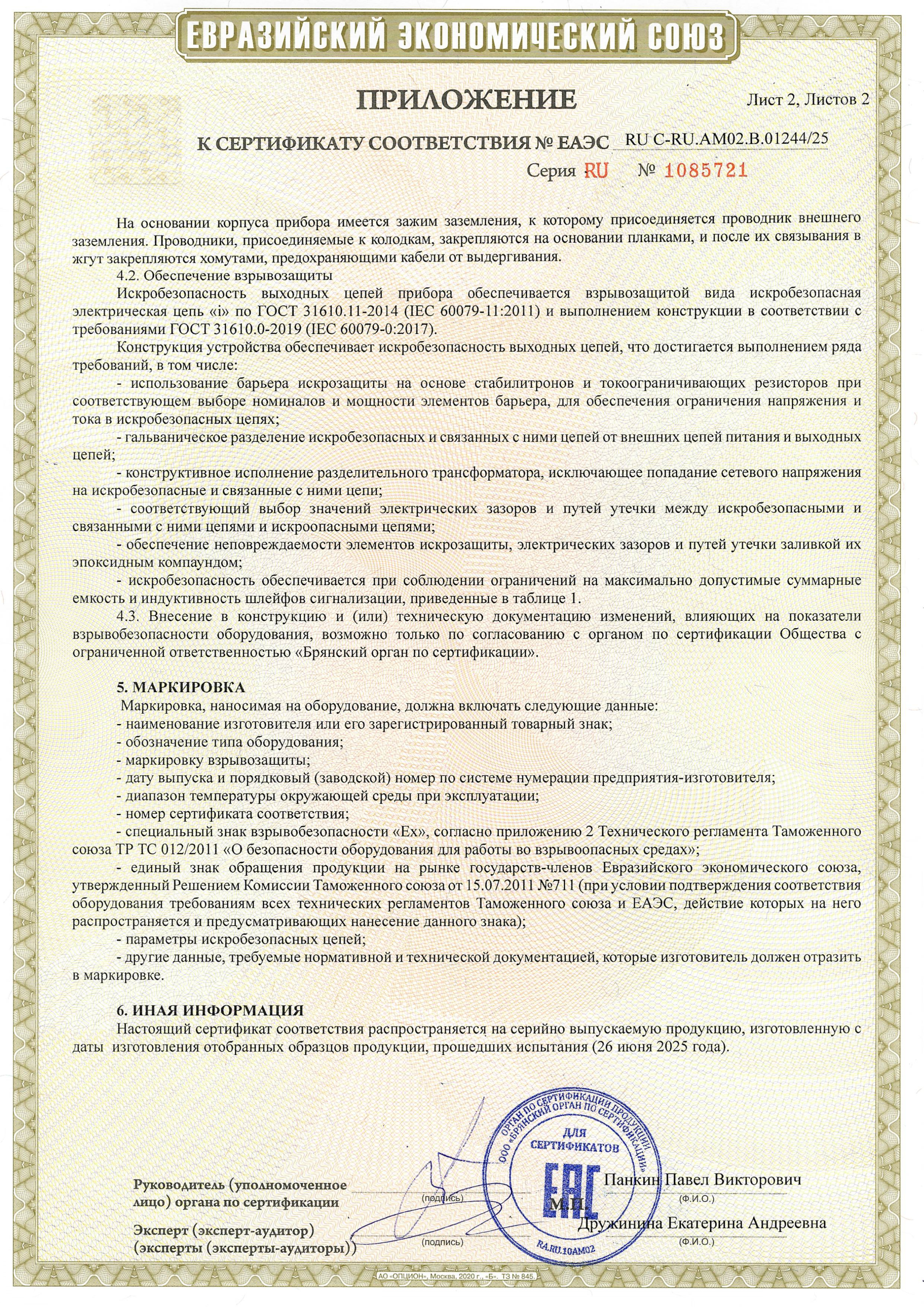 Прибор имеет входные искробезопасные цепи уровня "ia" подгруппы IIB,имеет маркировку взрывозащиты (Exia)IIB, соответствует требованиям ГОСТ Р 51330.0, ГОСТ Р 51330.10 и предназначен для установки вне взрывоопасных зон помещений и наружных установок.