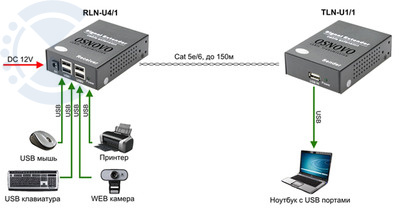 Удлинитель интерфейса USB 2.0 по сети Ethernet. Расстояние передачи "точка-точка" по кабелю витой пары до 150м. Подключение устройств в режиме "Plug and Play".