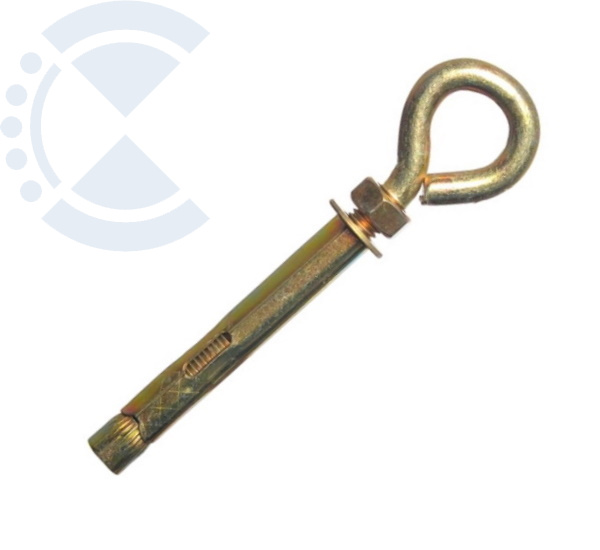 Предназначен для крепления материалов и конструкций к потолку, стенам, наклонным поверхностям. Он может быть использован как на производстве, так и в строительстве и быту. Стальной болт снабжен конусообразной гайкой, которая при завинчивании смещается по резьбовой части и происходит распирание муфты, что приводит к дополнительной надежности соединения деталей. Анкерный болт с кольцом применяется в тяжелогрузных конструкциях с природным камнем, бетоном и кирпичом.