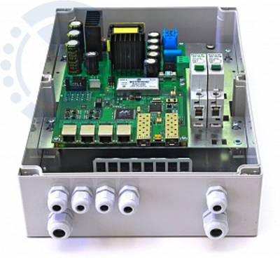 PSW-2G+ представляет собой всепогодный (IP66) компактный бокс (240х360х120 мм), изготовленный из прочного высококачественного пластика. Внутри блока установлена плата коммутатора, блок питания, оптический кросс и DIN-рейка.