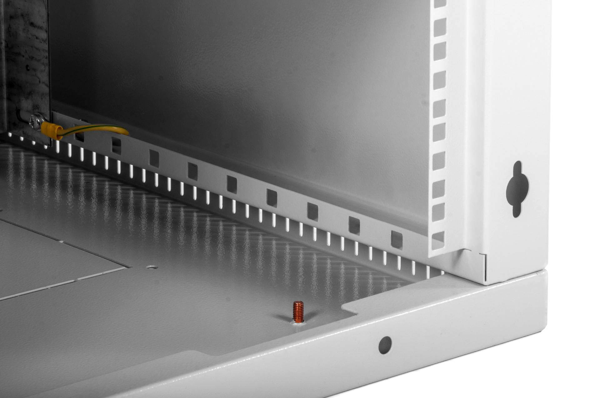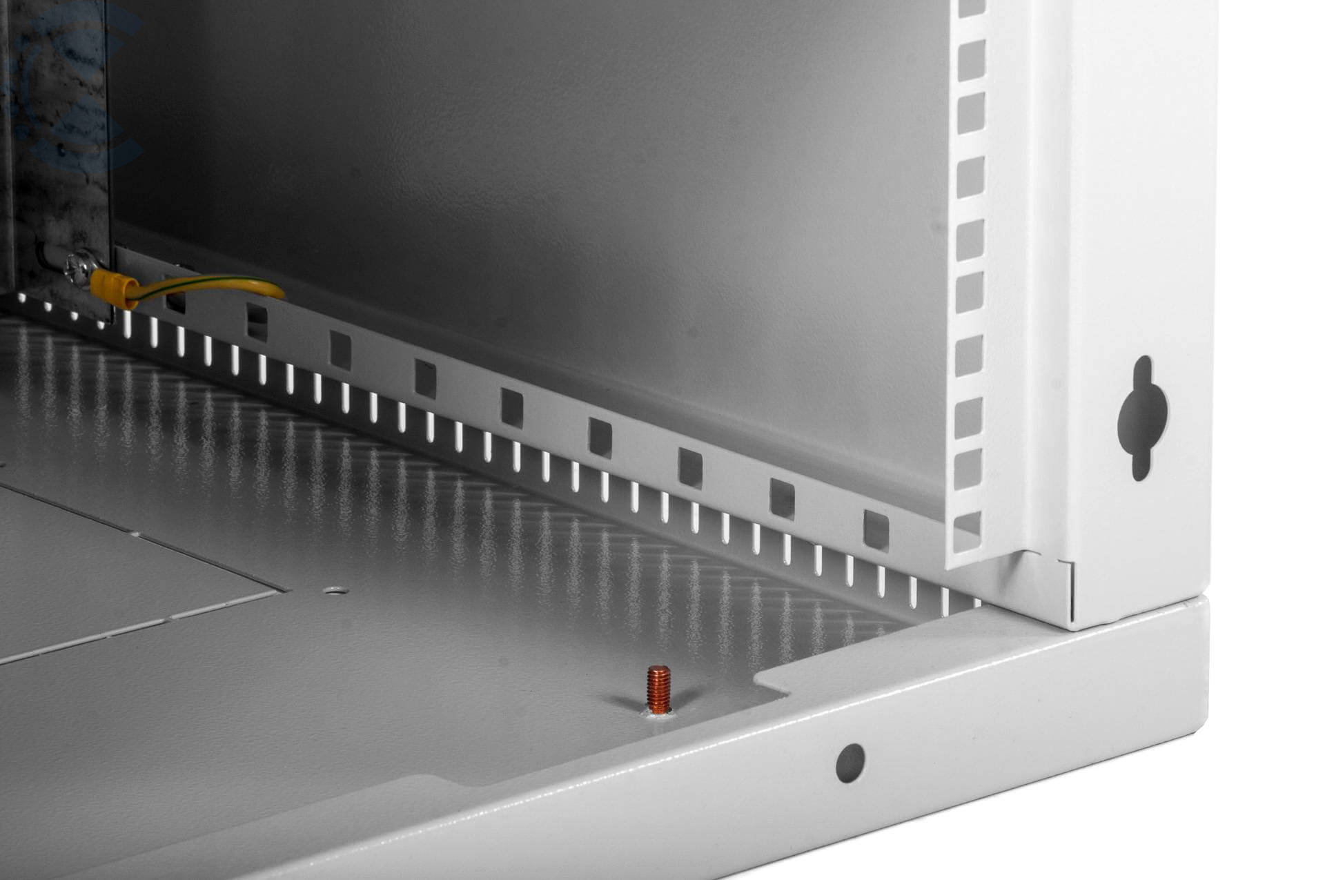 Настенный шкаф 19" ШРН-Э имеет полностью разборную конструкцию и состоит из пяти основных частей: крыша, дно, две боковые стенки, дверь. Настенный шкаф 19" ШРН-Э легок в сборке. За счет элементов крепления каркас шкафа имеет повышенную жесткость. Возможна комплектация металлической дверью и дверью с тонированным стеклом. Возможна установка двери как с правой, так и с левой стороны. Дверь фиксируется точечным замком. Предусмотрены два кабельных ввода в верхней и нижней частях шкафа, размер – 95х40мм. Перфорация обеспечивает хорошую вентиляцию установленного оборудования. В основание или крышу шкафа возможна установка вентиляторного модуля МВ-400-2. Для установки модуля демонтируется заглушка, и модуль фиксируется шестью винтами. Вертикальные направляющие регулируются по глубине. Система заземления входит в стандартную комплектацию. Возможна установка задней стенки.