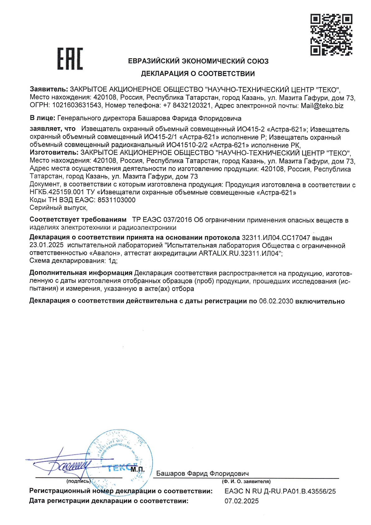 Предназначен для обнаружения проникновения в охраняемое пространство и разрушения стекол, остекленных конструкций закрытых помещений и формирования извещения о тревоге путем размыкания выходных контактов сигнальных реле.
