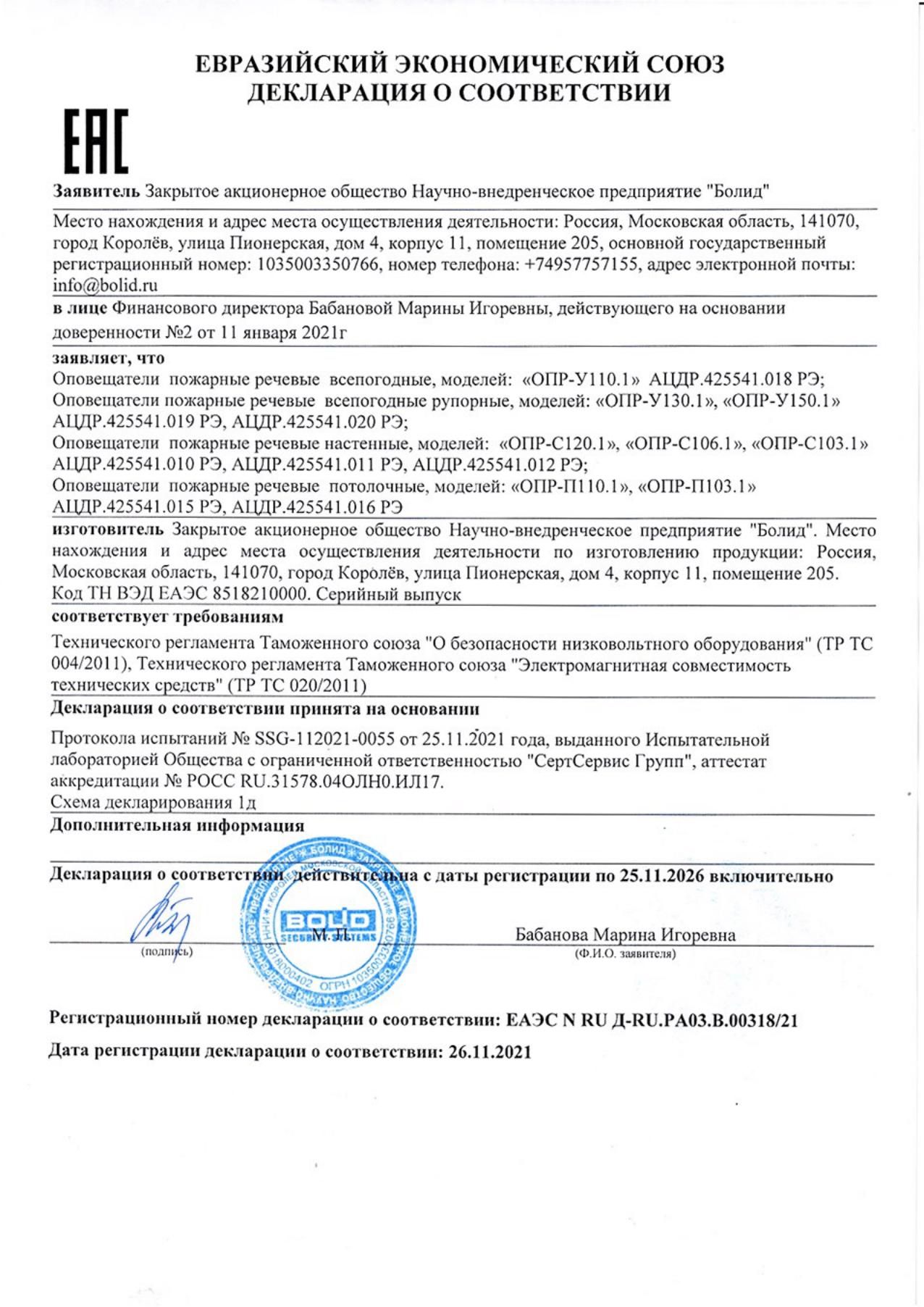 Оповещатель предназначен для использования совместно с блоками речевого оповещения "Рупор-200" или "Рупор-300" или аналогичными блоками речевого оповещения, имеющими высокоомный выход (100 В)