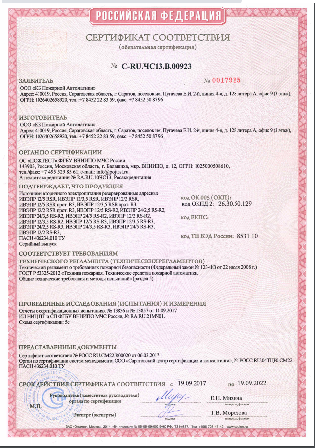 Источник питания номинальным постоянным напряжением 24 В и выходным током до 2,5 А. Предназначен для стабильного бесперебойного электропитания систем охранной и пожарной сигнализации, пожаротушения, дымоудаления и оповещения.