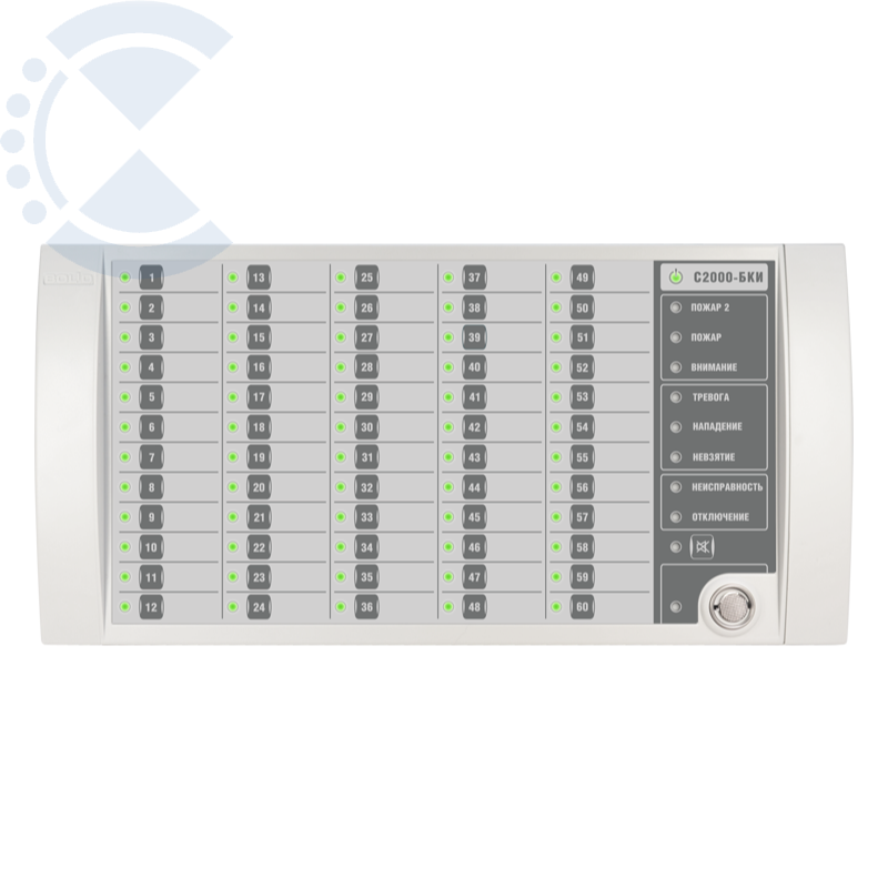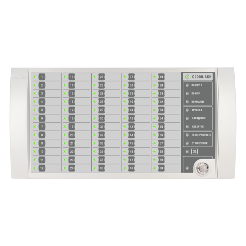 - Раздельное отображение на 60 двухцветных индикаторах состояний контролируемых разделов: "Взят", "Взятие", "Снят", "Тревога", "Нападение", "Невзятие", "Пожар", "Внимание", "Неисправность", "Нарушение технолог. ШС", "Норма технолог. ШС", "Протечка", "Повышение/Понижение температуры", "Повышение/Понижение уровня", "Дверь Взломана", "Дверь Заблокирована", "Дверь Открыта/закрыта", "Доступ закрыт/открыт/в норме"