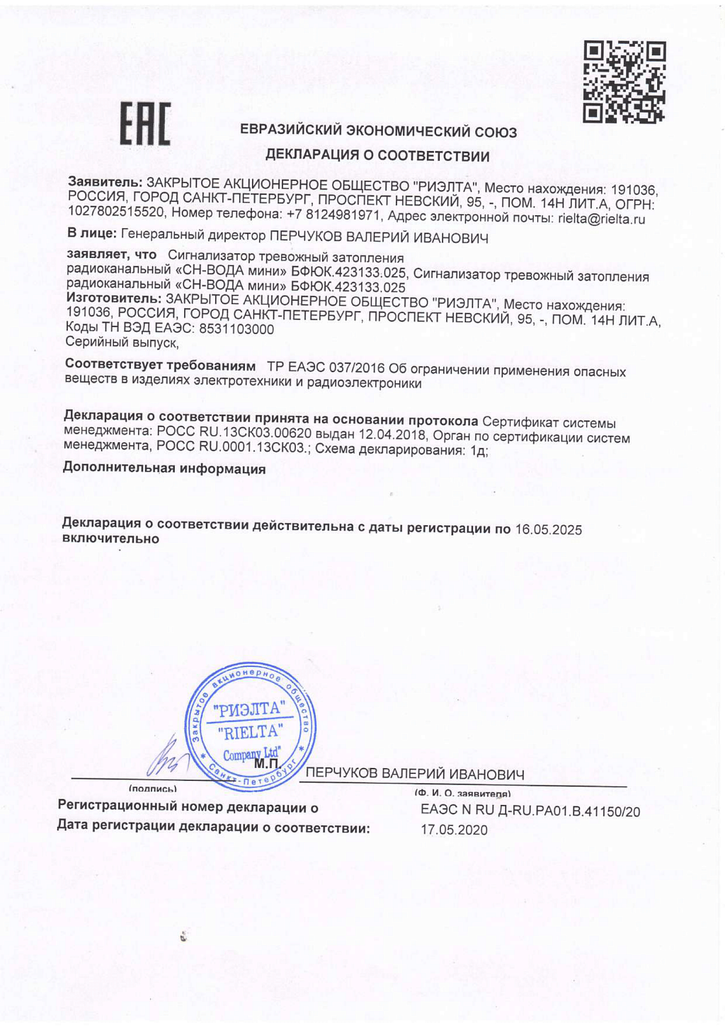 Датчик протечки воды радиоканальный, рабочая частота 433,05...434,79 МГц, индикация режимов работы, элемент питания CR123A(основной) CR2032 (резервный), степень защиты оболочкой IP30, диапазон рабочих температур -20…+50°С, габаритные размеры112×41×32 мм