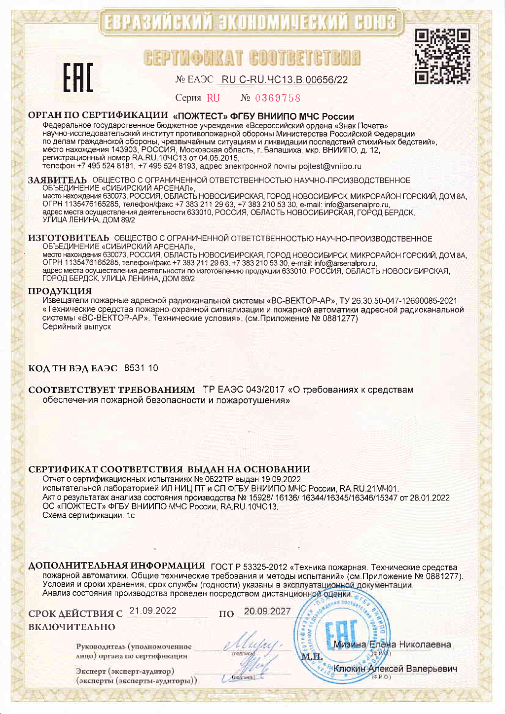 Тепловой максимально-дифференциальный, адресно-аналоговый радиоканальный, t-сраб.54...65°С, дальность связи до 550 м, CR123A (основной), CR2032 (резервный), IP23, t-раб.-30...+50°С, 85х50 мм