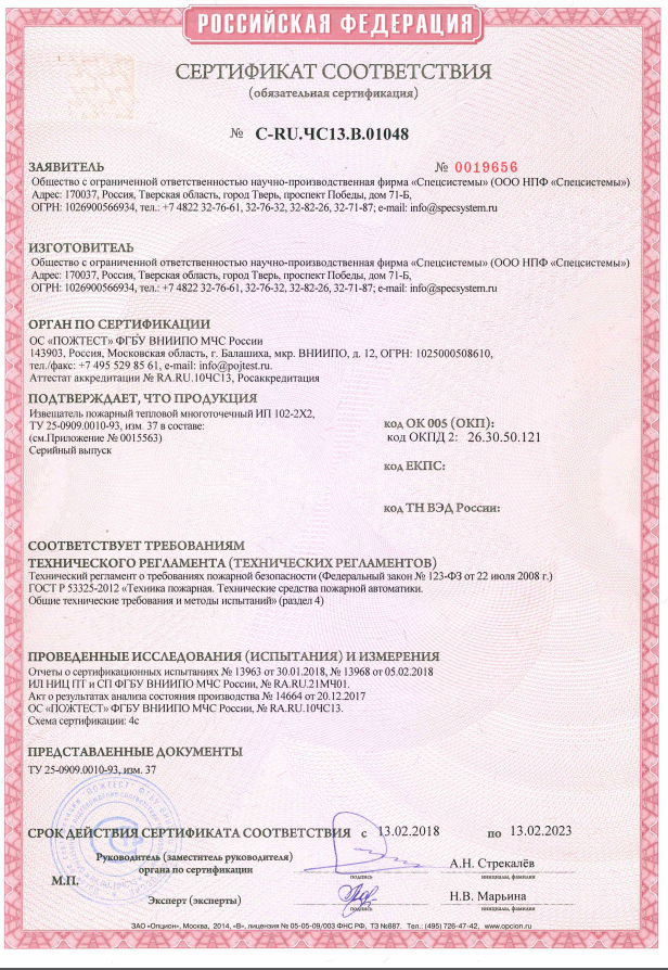 Извещатель ИП-102-2х2 предназначен для обнаружения скорости нарастания температуры окружающей среды в закрытых помещениях со взрывоопасными зонами и агрессивными средами и выдачи сигнала тревоги на приемно-контрольные, пожарные и охранно-пожарные приборы, работающие с токопотребляющими пожарными извещателями (приборы приемно-контрольные пожарные ППКП 019-20/60 (ППС-3), пульты приемно-контрольные ППК-2, "Сигнал-42", "Рубеж", "Аргус", "Радуга", "Сигнал-20П", устройства сигнально-пусковые пожарные УСПП 1041-4-1,устройство охранной телесигнализации УОТС-1-1 и т.п., а также (при исполнении 02) с комплексом технических средств пожарной сигнализации для морских и речных судов КТС "СПАС-СМ". Допускается автономное включение извещателя с резервированными источниками питания РИП (24 + 6)В.