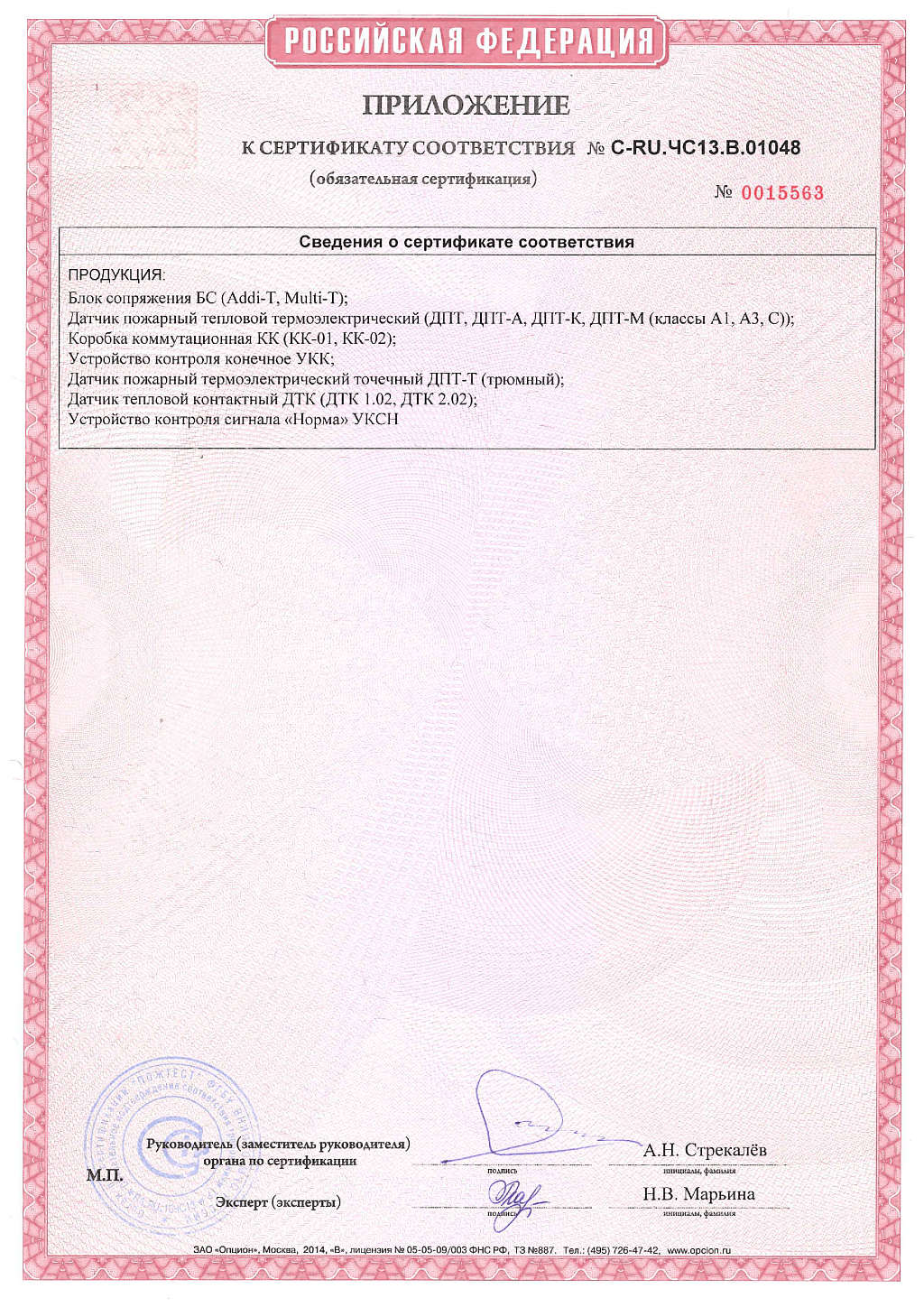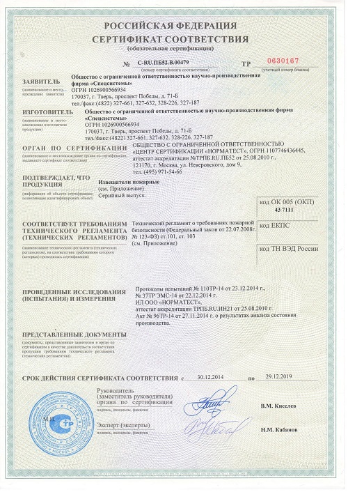 Извещатель имеет два порога срабатывания, соответствующие значениям скорости нарастания температуры окружающей среды и инерционности и выдачи сигнала "Пожар" на заданном пороге срабатывания при воздействии на часть его термоэлектрического датчика ДПТ длиной 10 м окружающей среды с температурой, изменяющейся со скоростью, соответствующей этому порогу.