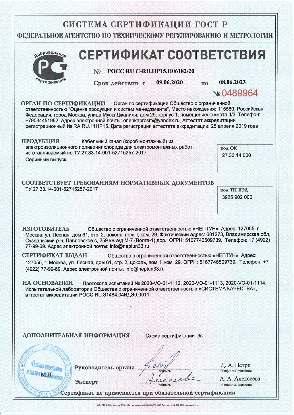 Кабельный канал предназначен для защиты проводов и кабелей от механических повреждений. Материал изготовления - ПВХ пластикат (соответствует требованиям пожарной безопасности по ГОСТ, категория горения ПВ-0) препятствует возгоранию изделия. Двойной замок надежно удерживает крышку и обеспечивает доступ к электропроводке при расширении сети и в аварийных ситуациях, без риска потери эксплуатационных свойств. Кабельный канал имеет высокую коррозионную, химическую стойкость и высокую пластичность.