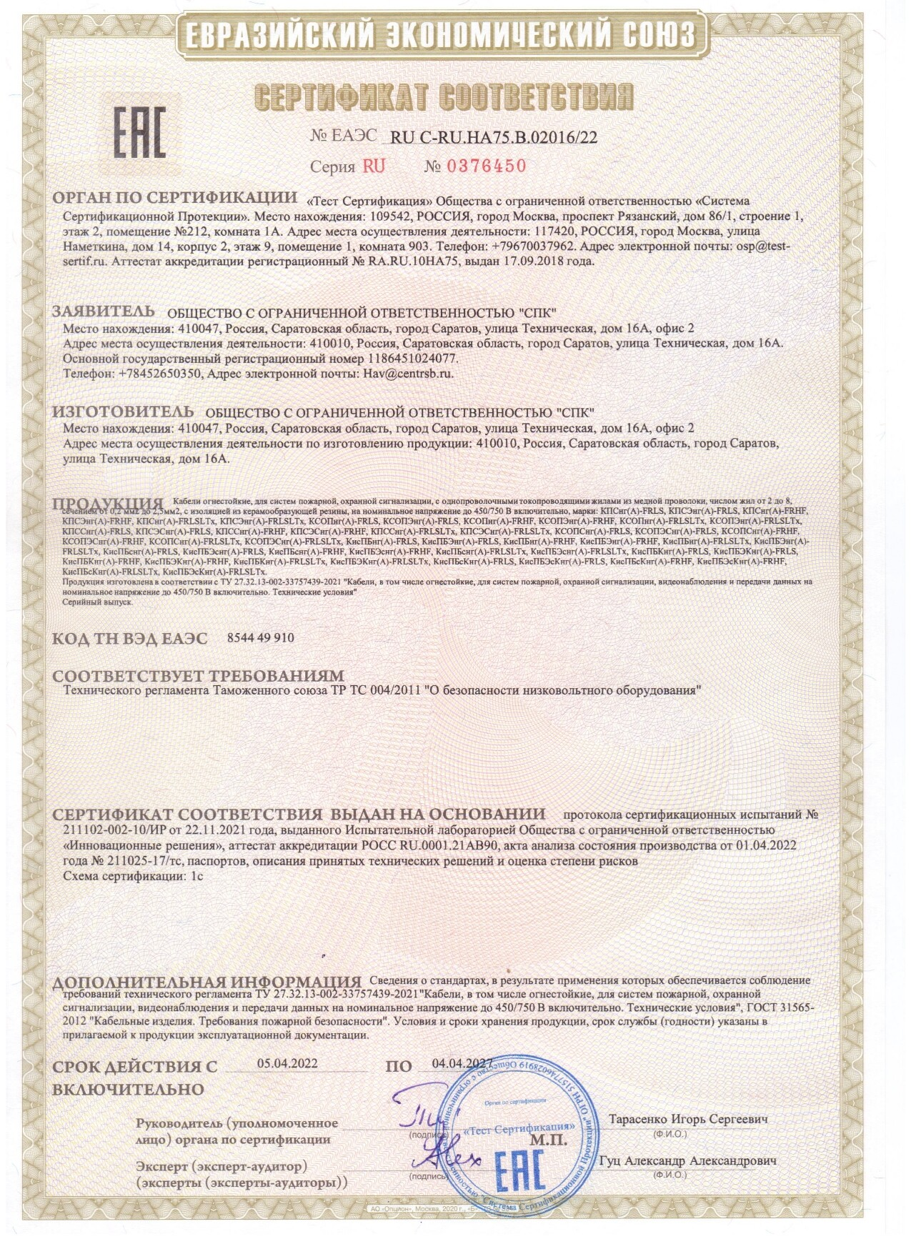 Кабель огнестойкий однопроволочный 1х2х0,75 кв мм с низким дымо и газовыделением (бухта 200м) (оранжевый)