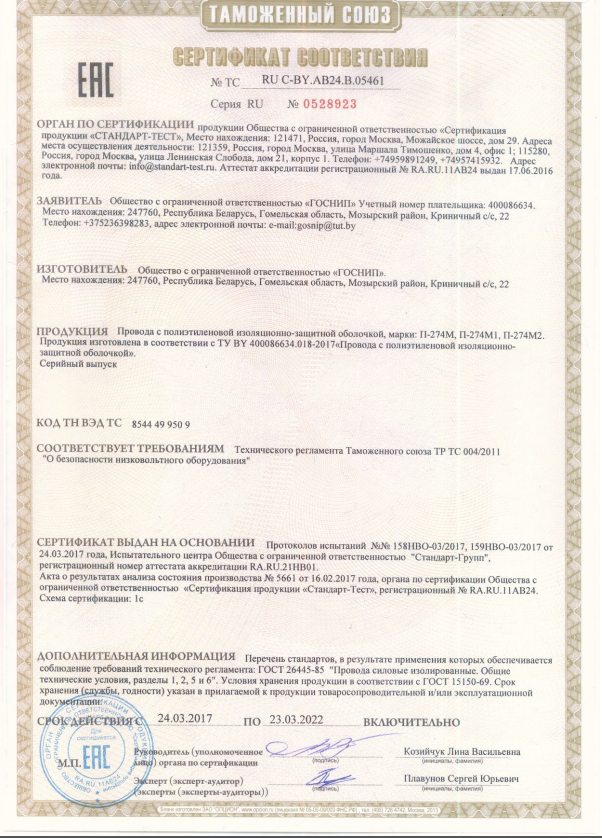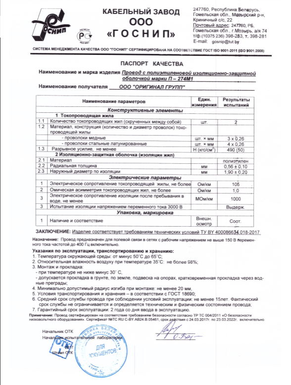 Провод с многопроволочными медными и стальными проводами (4 жилы медных + 3 жилы стальных) с полиэтиленовой изоляцией, 1 пара, 2,2х4,5 мм, сечение жил = 0,5 кв. мм, R = 65 Ом/км (500 м бухта)