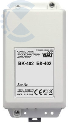 БК-402. Блок коммутации домофона обеспечивает переключение линий связи и видеосигнала. Применяется в составе системы ограничения доступа в огороженную придомовую территорию в случае, если огороженная территория имеет два или более входа. Предназначен для совместной работы с БУД-420Р и БУД-485Р, установленных на входе в огороженную придомовую территорию, и видеодомофонами VIZIT (до 16 шт), установленными на подъездах(домах) внутри огороженной территории.