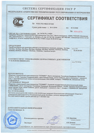 Электротехнические короба DeGross, по результатам испытаний по НПБ 246-97, ГОСТ 27483-87 на стойкость к воздействию нагретой проволокой, открытым пламенем на стойкость к распространению горения, относится к группе самогасящихся, не капающих при воздействии огнем материалов и соответствует требованиям по трудновоспламеняемости.
