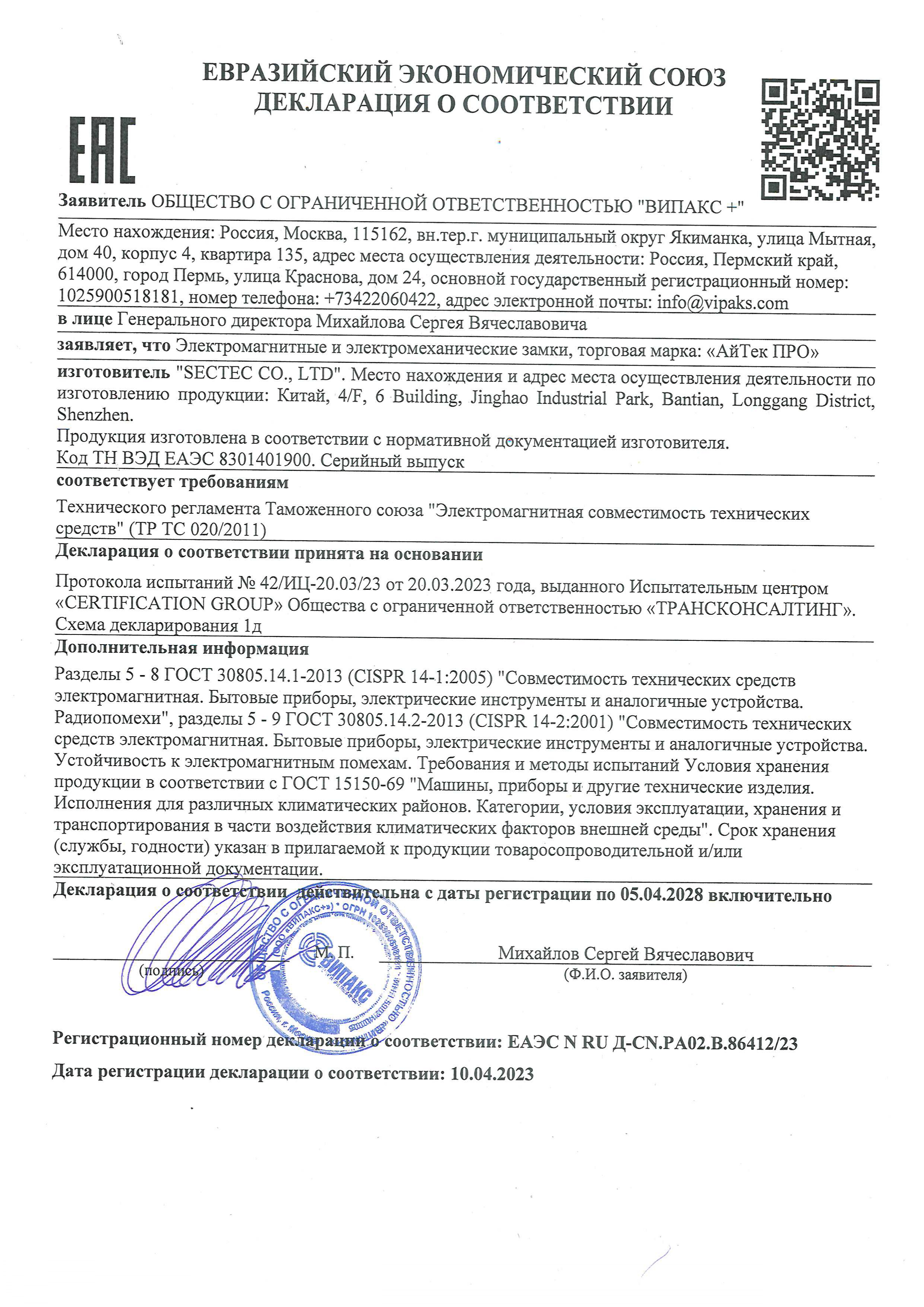 Комплектация | 1. Электромагнитный замок – 1 шт. 2. Якорь – 1 шт. 3. Планка – 1 шт. 4. Руководство по эксплуатации – 1 шт. 5. Паспорт – 1 шт. 6. Монтажный комплект - 1 шт.
