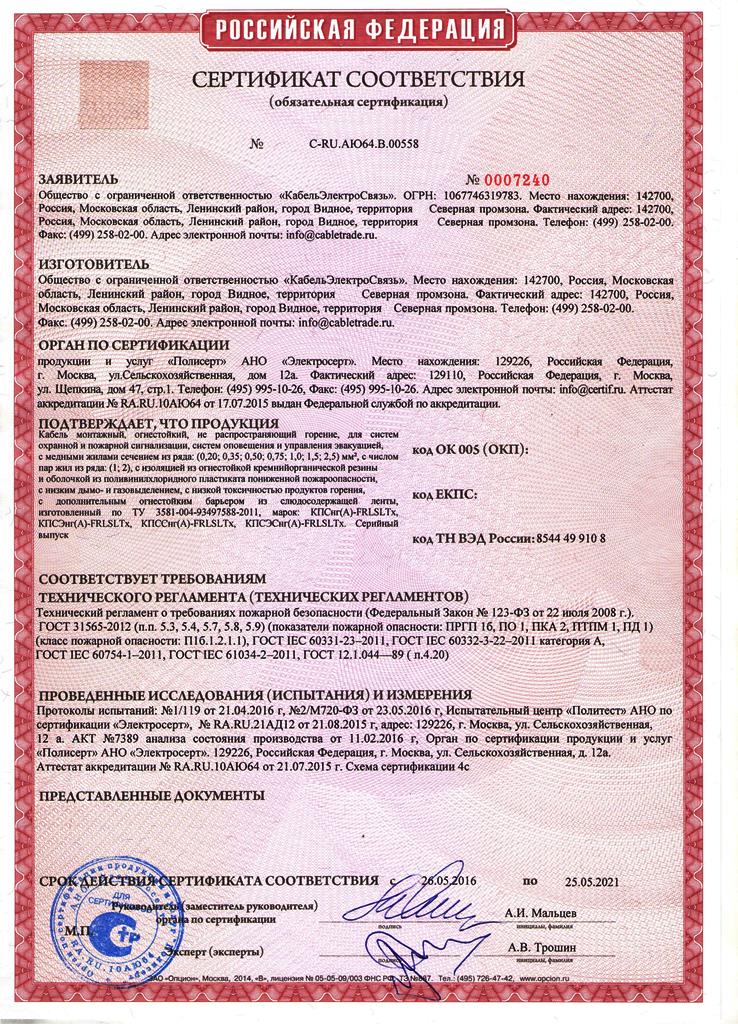 Кабели огнестойкие с медными однопроволочными жилами 1х2х0,75 кв мм, с изоляцией из кремнийорганической резины и оболочкой из ПВХ пластиката с пониженным газо- и дымовыделением и низкой токсичностью продуктов горения. Применяются в системах пожарной и охранной сигнализации (ОПС), системах оповещения и управления эвакуацией (СОУЭ) и передачи данных. Внешний D=6мм.