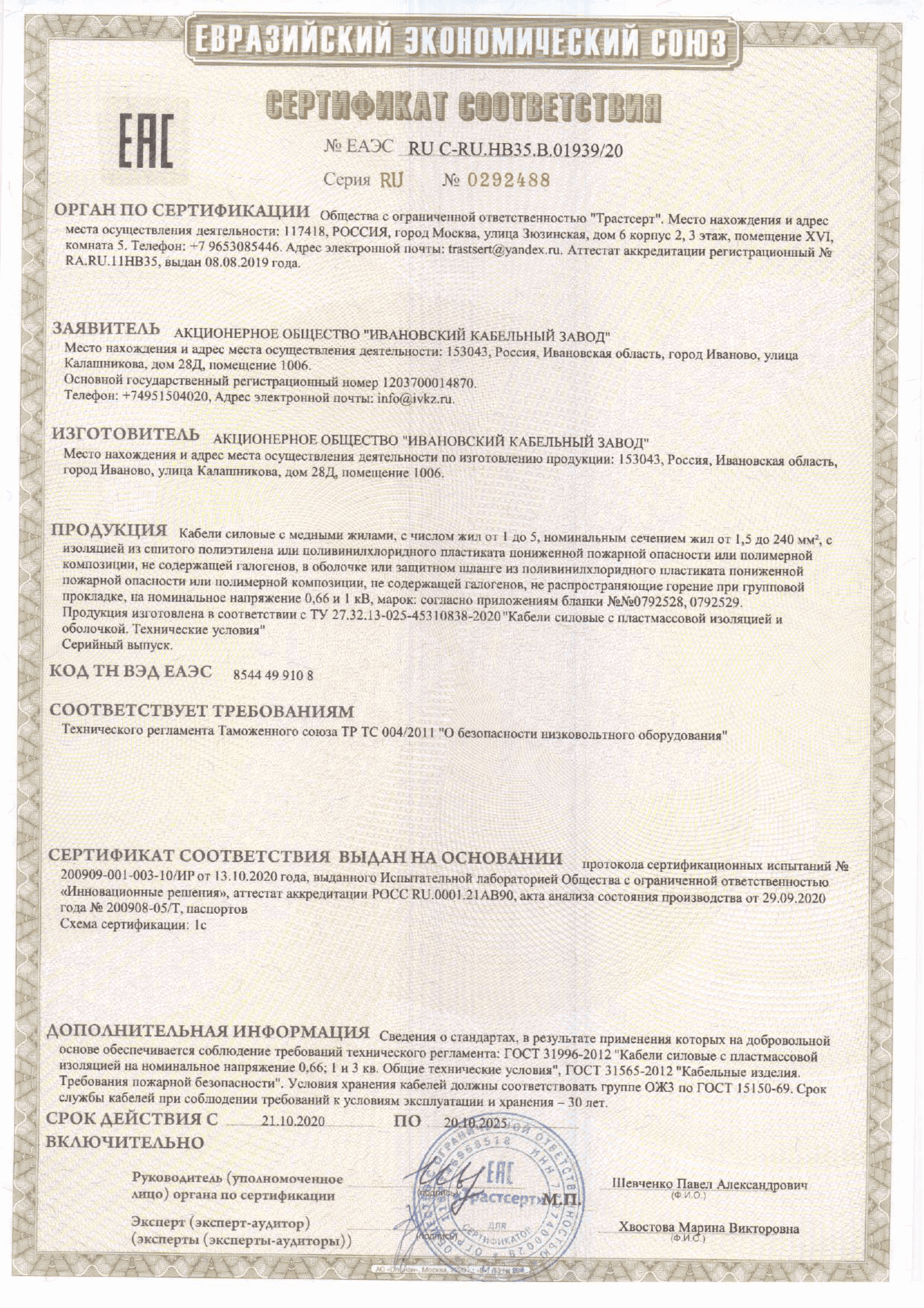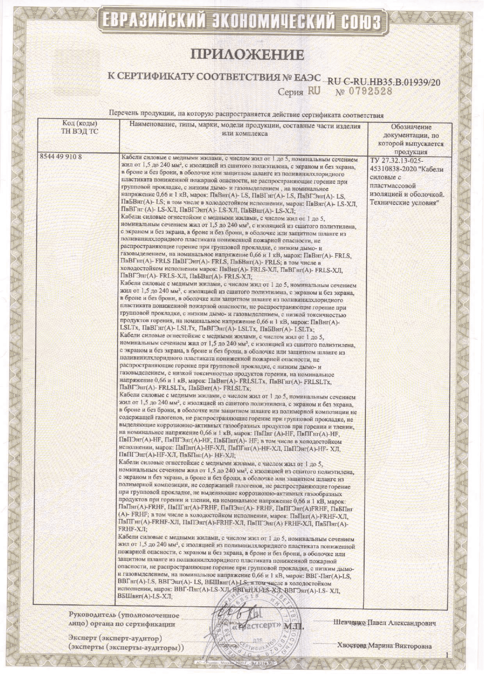 Кабель с медными однопроволочными токопроводящими жилами, с термическим барьером в виде двух слюдосодержащих лент, с изоляцией и оболочками (внутренней и наружной) из ПВХ-композиции пониженной пожароопасности с низким дымогазовыделением. Предназначен для передачи и распределения электроэнергии в стационарных установках.