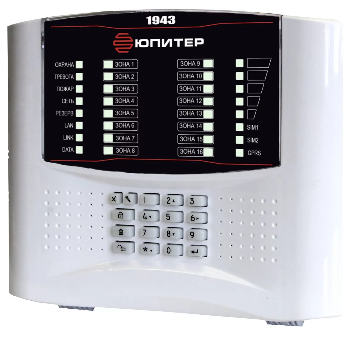 Прибор приемно-контрольный охранно-пожарный, GPRS/SMS (2 SIM карты/SMA разъем), 1 Ethernet; 16 ШС с расширением до 64 ШС (Юпитер-3811/3812), U-шс. 22 В, I-шс. 3.6 мА, 16 разделов, RS-485, USB, вход ТМ, 4 реле (250 В/5 А) с расширением до 16 реле (Юпитер-3214), 2 выхода питания извещателей 12 В 100 мА каждый, 1 выход сирены 12 В 100 мА; U-пит. 12 В, I-потр. ≤650 мА, габ.размеры 250х220х52 мм, пластиковый корпус