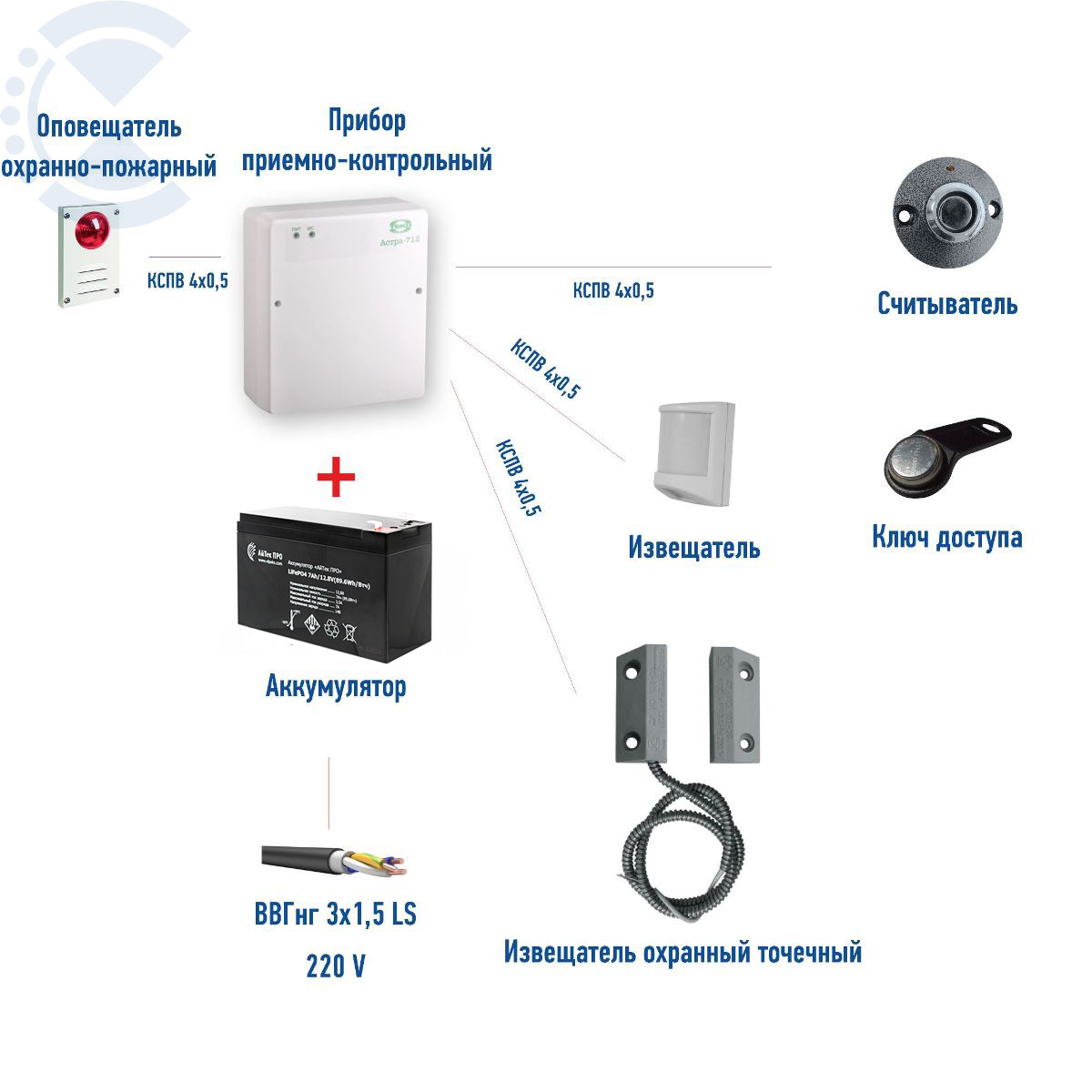 В основе системы лежит 2х шлейфный прибор АСТРА, ставится/снимается с помощью считывателя ТМ-Н и ключей Dallas, Подключаем его к сети в помощью кабеля ВВГнг LS, вставляем внутрь АКБ 7а/ч для бесперебойной работы системы. С помощью кабеля КСПВ подключаем к нему извещаетели. В случае тревоги срабатывает сирена.