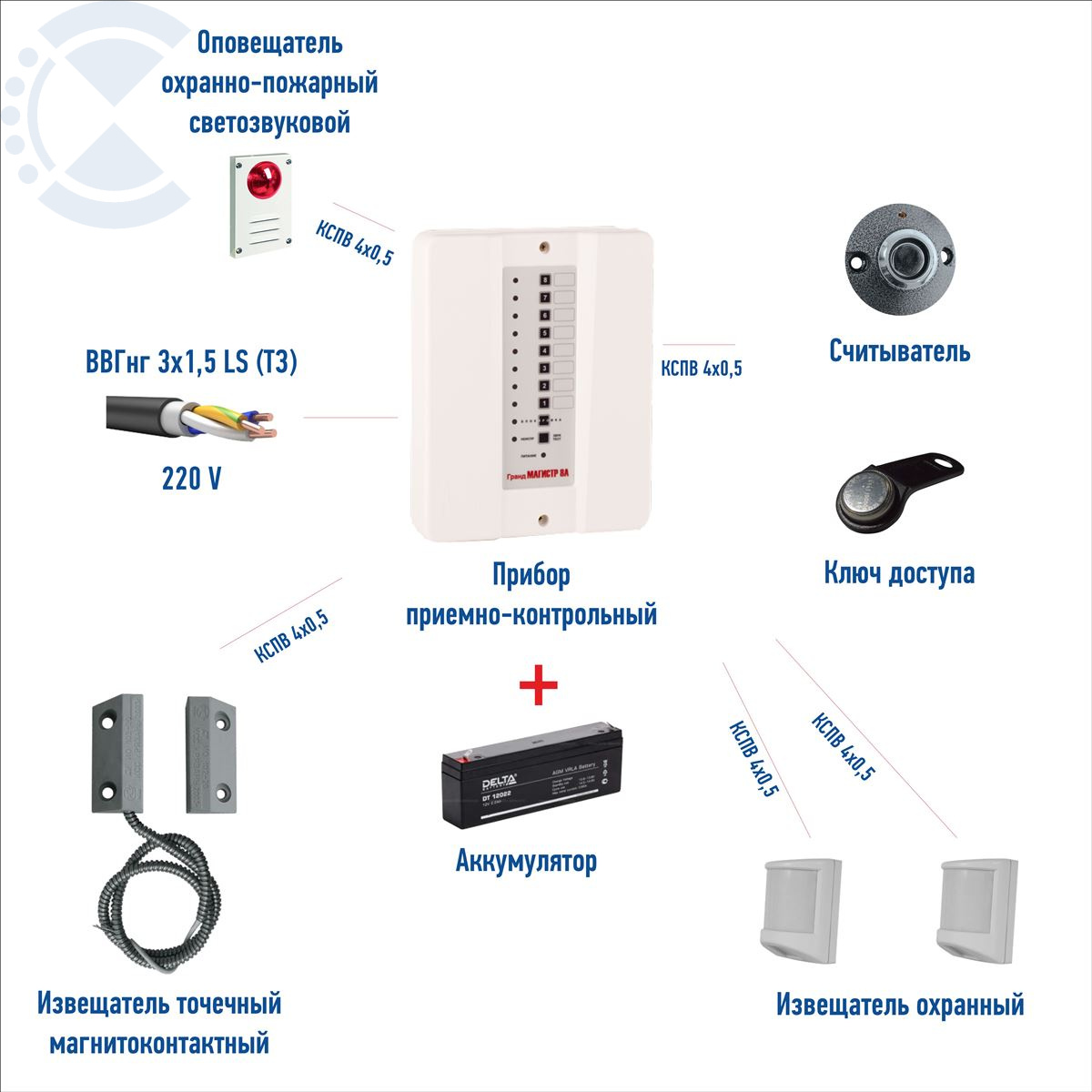 В основе системы лежит 4х шлейфный прибор ГрандМагистр, ставится/снимается с помощью считывателя ТМ-Н и ключей Dallas, Подключаем его к сети в помощью кабеля ВВГнг LS, вставляем внутрь АКБ 2.2 а/ч для бесперебойной работы системы. С помощью кабеля КСПВ подключаем к нему извещаетели. В случае тревоги срабатывает сирена.