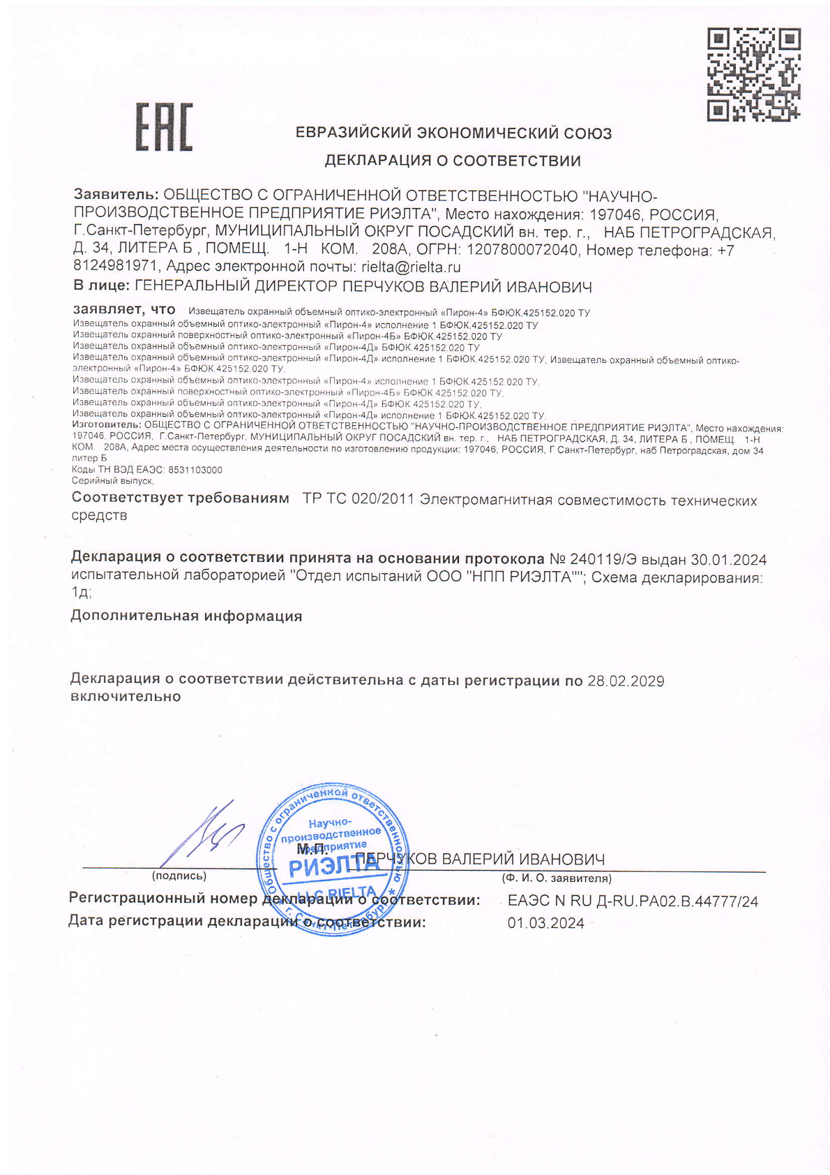 Извещатель охранный объемный оптико-электронный «Пирон-4Д» исполнение 1.