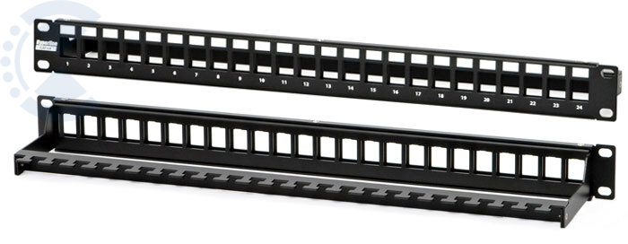 Hyperline PPBL3-19-24-SH-RM Модульная патч-панель 19", 24 порта, Flat Type, 1U, для экранированных и неэкранированных модулей Keystone Jack (кроме KJ1-C2, KJ2-C5e, KJ2-C6), с задним кабельным организатором (без модулей)