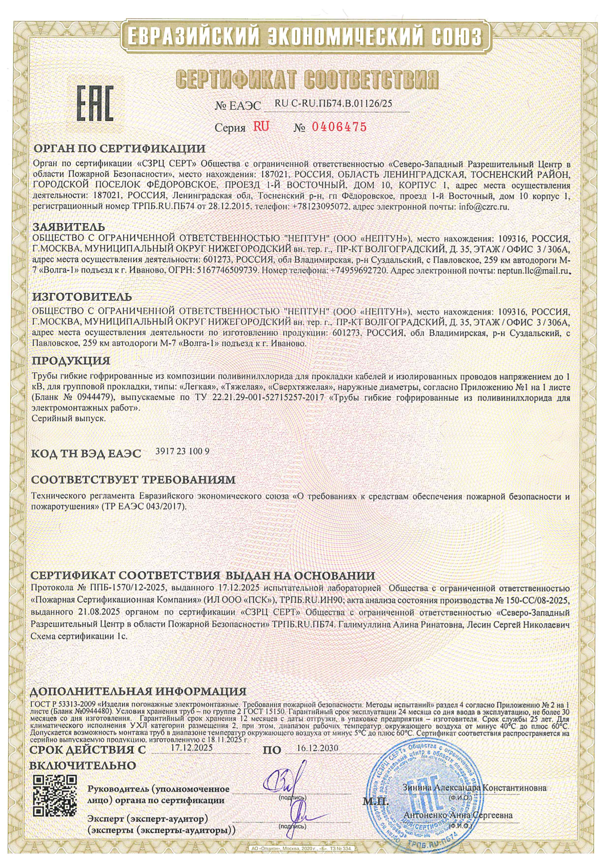 Гофрированная труба из ПВХ подходит для защиты изолированных проводов и кабелей от механических повреждений и агрессивного воздействия окружающей среды. Материал изготовления - ПВХ пластикат (соответствует требованиям пожарной безопасности по ГОСТ, категория горения ПВ-0) препятствует возгоранию изделия. Труба имеет высокую коррозионную и химическую стойкость. Труба является диэлектриком, что гарантирует защиту от поражения электрическим током. Выдерживает статическую нагрузку до 35 кг. Подходит для использования в помещениях или на открытом воздухе, без прямого воздействия солнечных лучей.