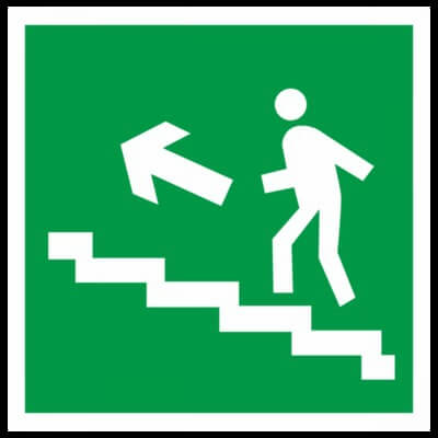 Направление к эвакуационному выходу по лестнице вверх налево применяется в качестве пиктограммы (наклейки) для световых эвакуационных указателей. Знак Е16 предназначен для размещения на лестничных площадках, а также стенах, прилегающих к лестничному маршу. Эвакуационный знак изготовлен на белой самоклеящейся пленке и с различными типоразмерами.