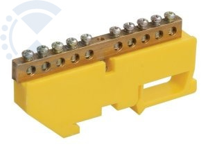 Шина PE "земля" в корпусном изоляторе на DIN-рейку, 10 контактов, I-нагр. 100 А, t-раб. -40 ... +50 °С, габ.размеры 88.5х42х77 мм, материал латунь, цвет желтый