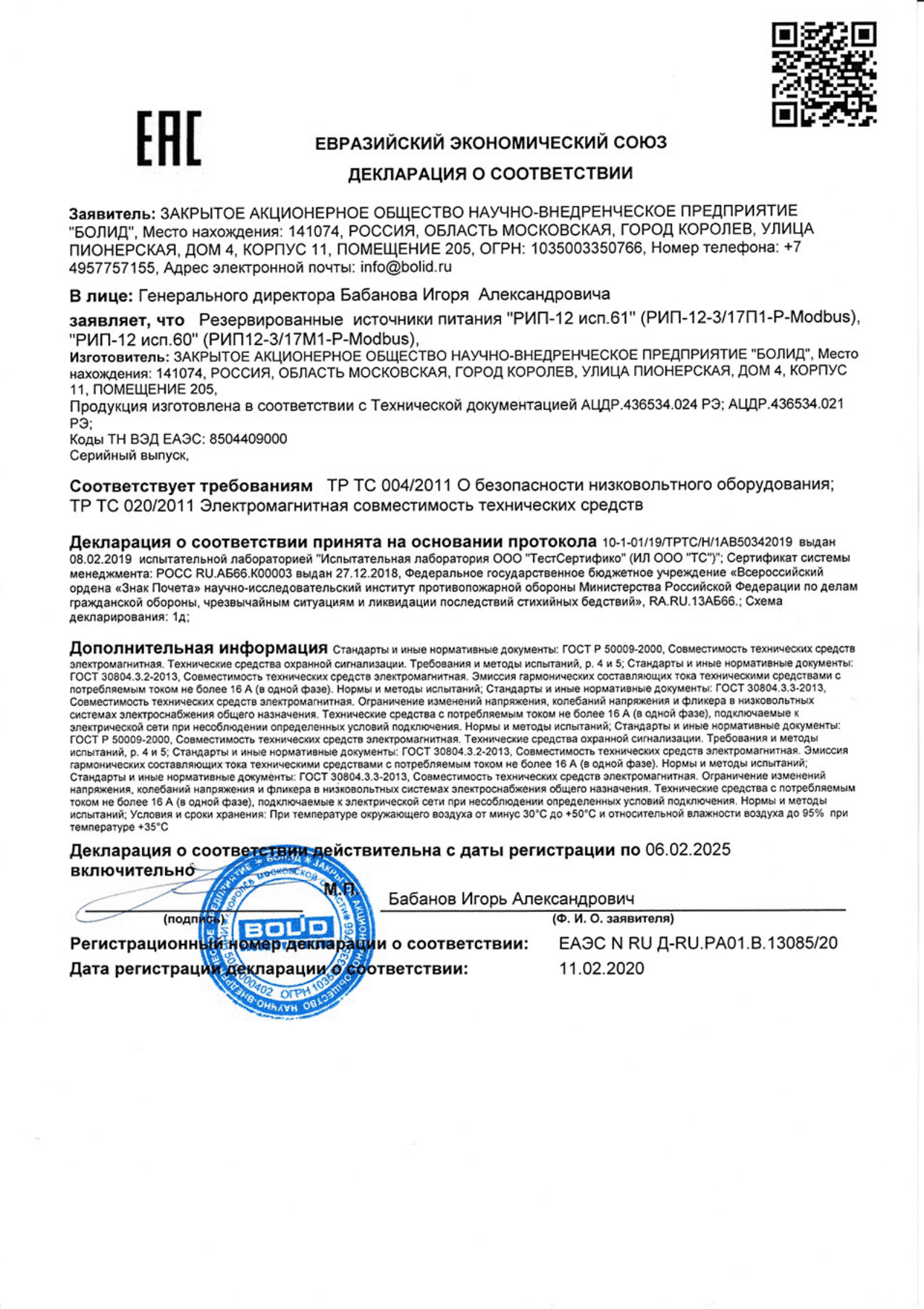 Блок питания РИП-12 (исп.60) (РИП-12-3/17М1-Р-Modbus) резервированный BOLID в Перми