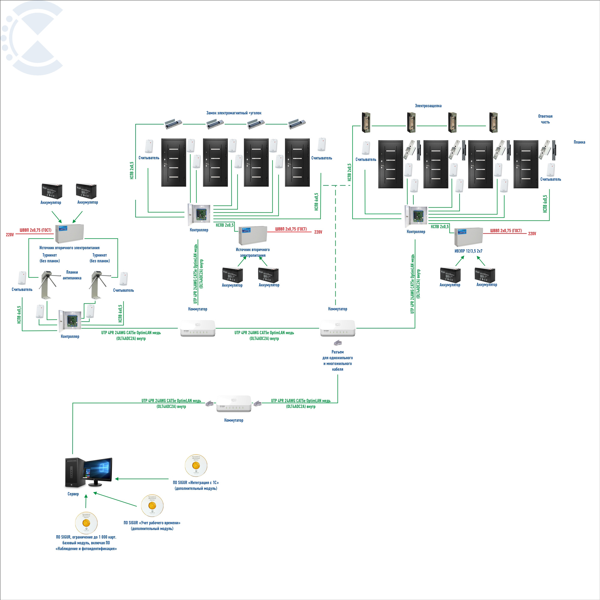 Примерная подборка оборудования на средний офис с 20 точками прохода: 2 турникета, 7 металлических дверей, 11 офисных деревянных. До 1000 сотрудников, Включен "Учет рабочего времени" и "Интеграция с 1С". Количество кабеля приведено абстрактно. Точное количество высчитывается на каждый объект отдельно и конкретно! Возможна подборка системы ограждений в стыковке с турникетом. Данные системы подбираются по чертежам и эскизам заказчика.