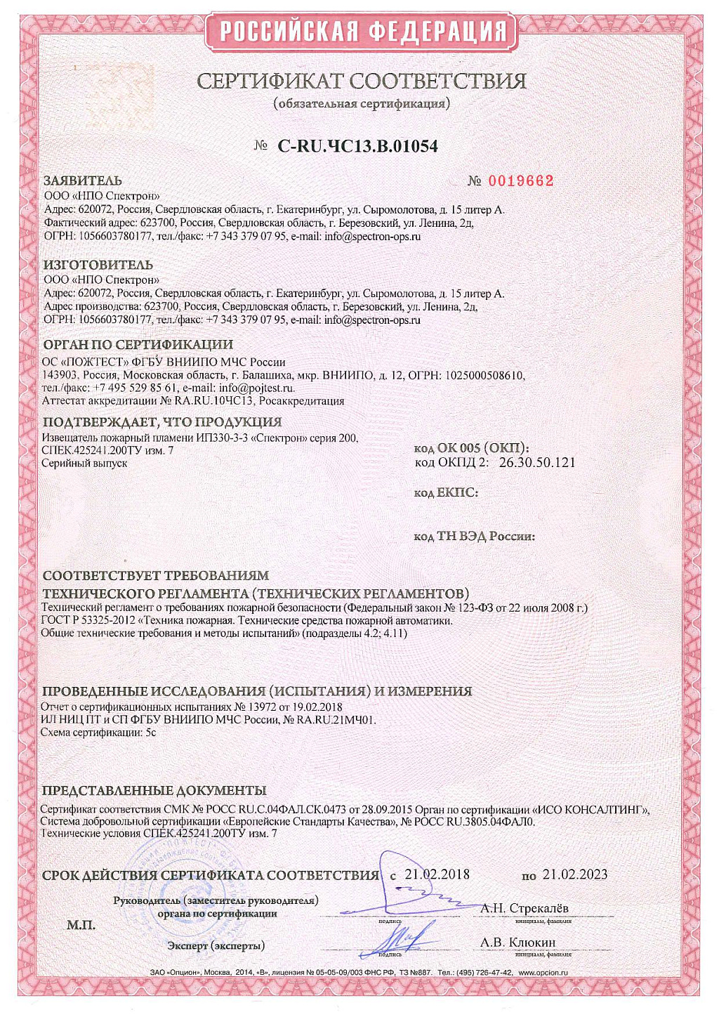 Сертификат соответствия Извещатель С2000-Спектрон-101-Т-Р-Н BOLID