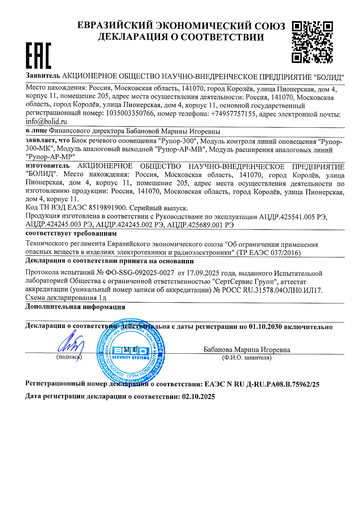 Блок речевого оповещения "Рупор-300" используется для воспроизведения записанных в блок или трансляции внешних речевых сообщений о действиях, направленных на обеспечение безопасности и оповещения при возникновении пожара и других чрезвычайных ситуаций. Блок может работать только в составе ИСО "Орион". Особенности прибора: включение блока в режим передачи сигналов оповещения осуществляется по команде от сетевого контроллера ИСО "Орион"; блок применяется как компонент блочно-модульного прибора управления в системах оповещения и управления эвакуацией ; воспроизводит речевые сообщения согласно их приоритетам. Блок допускает подключение до 20 модулей контроля "Рупор-300-МК", что позволяет построить разветвлённую линию оповещения.