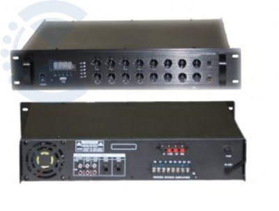 Усилитель 500 Вт, 3 микрофонных входа. (MIC1 с функцией «Приоритет»). 70 В/100 В/4-16 Ом, 5 зон/Alarm/USB/Bluetooth/FM. Материал корпуса: Металл (чёрного цвета), 482х310х88 мм.