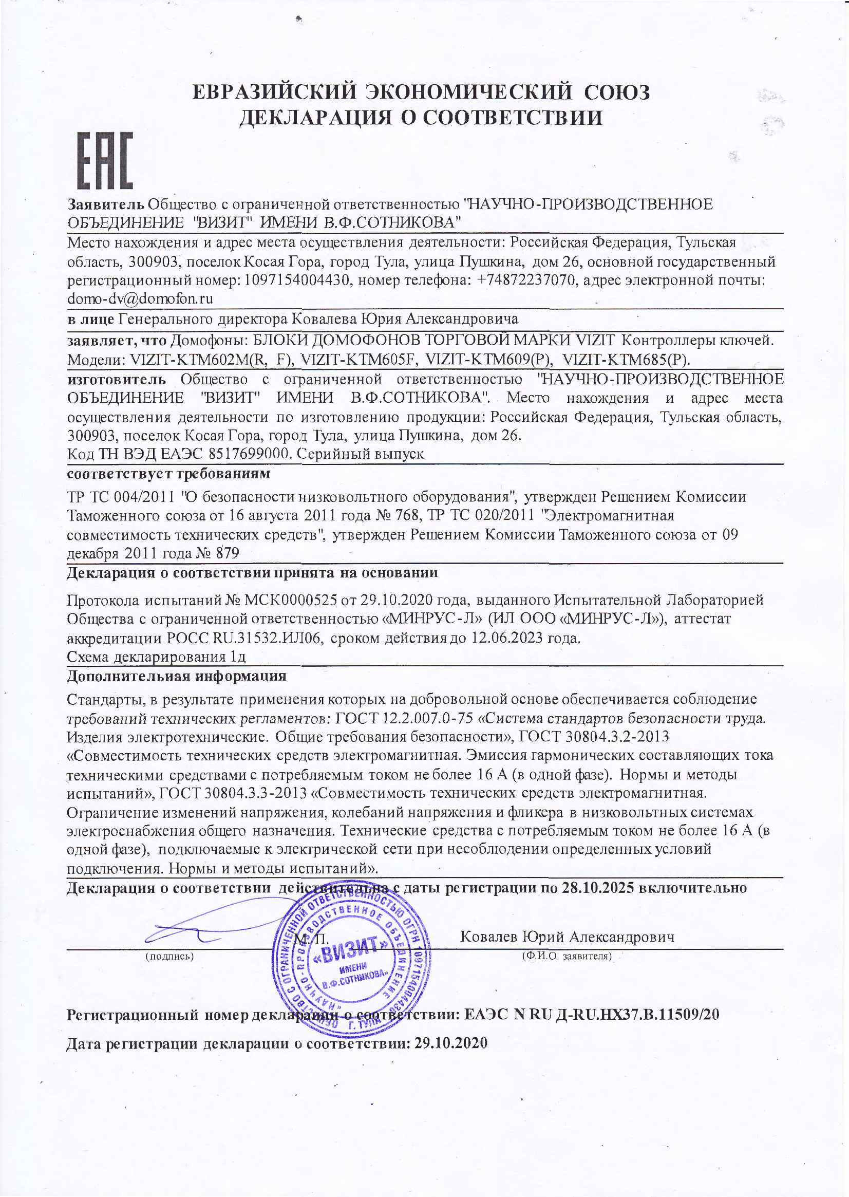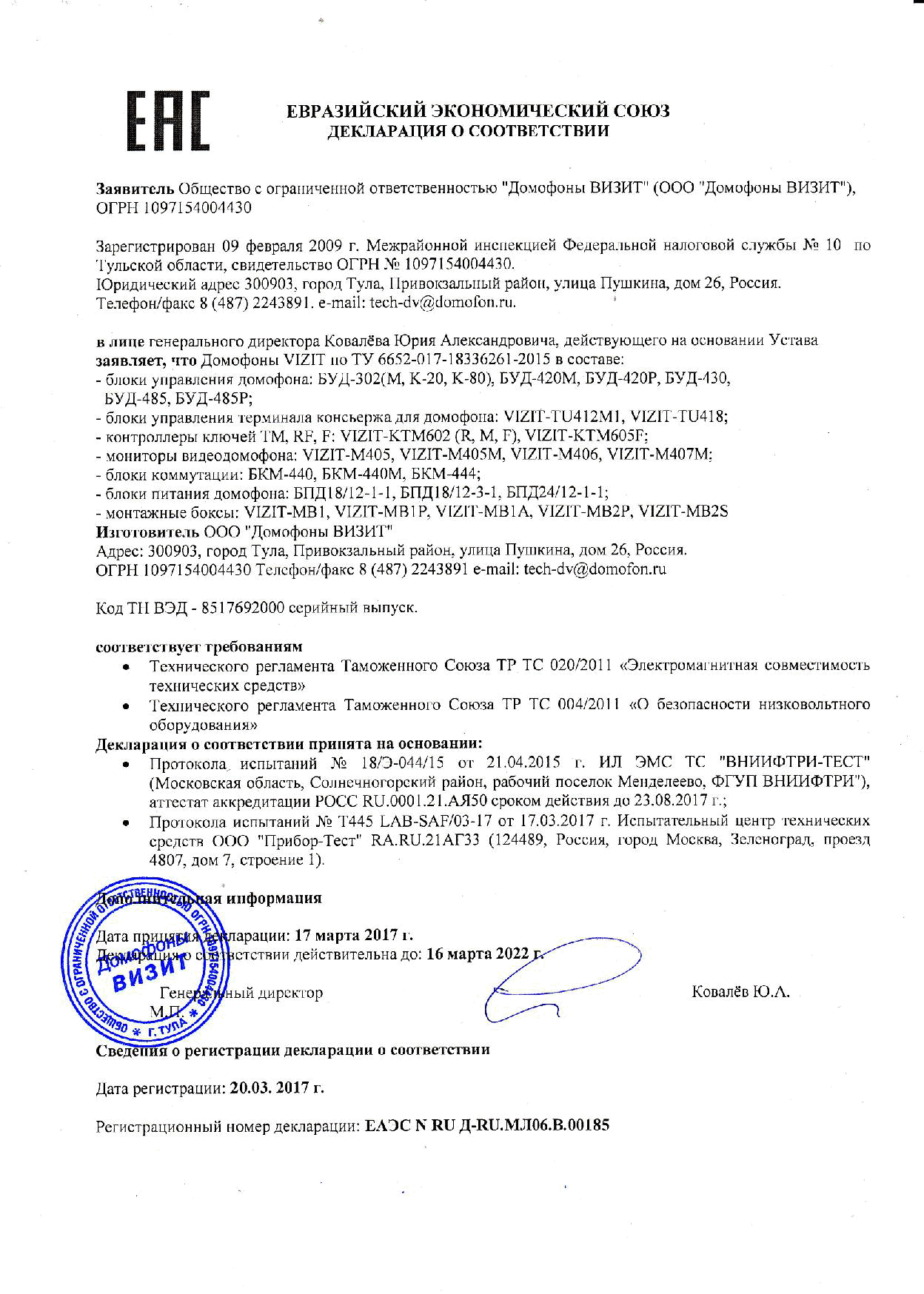 предназначено для работы в составе домофонов VIZIT (серии 300, 400, SM, N, M);