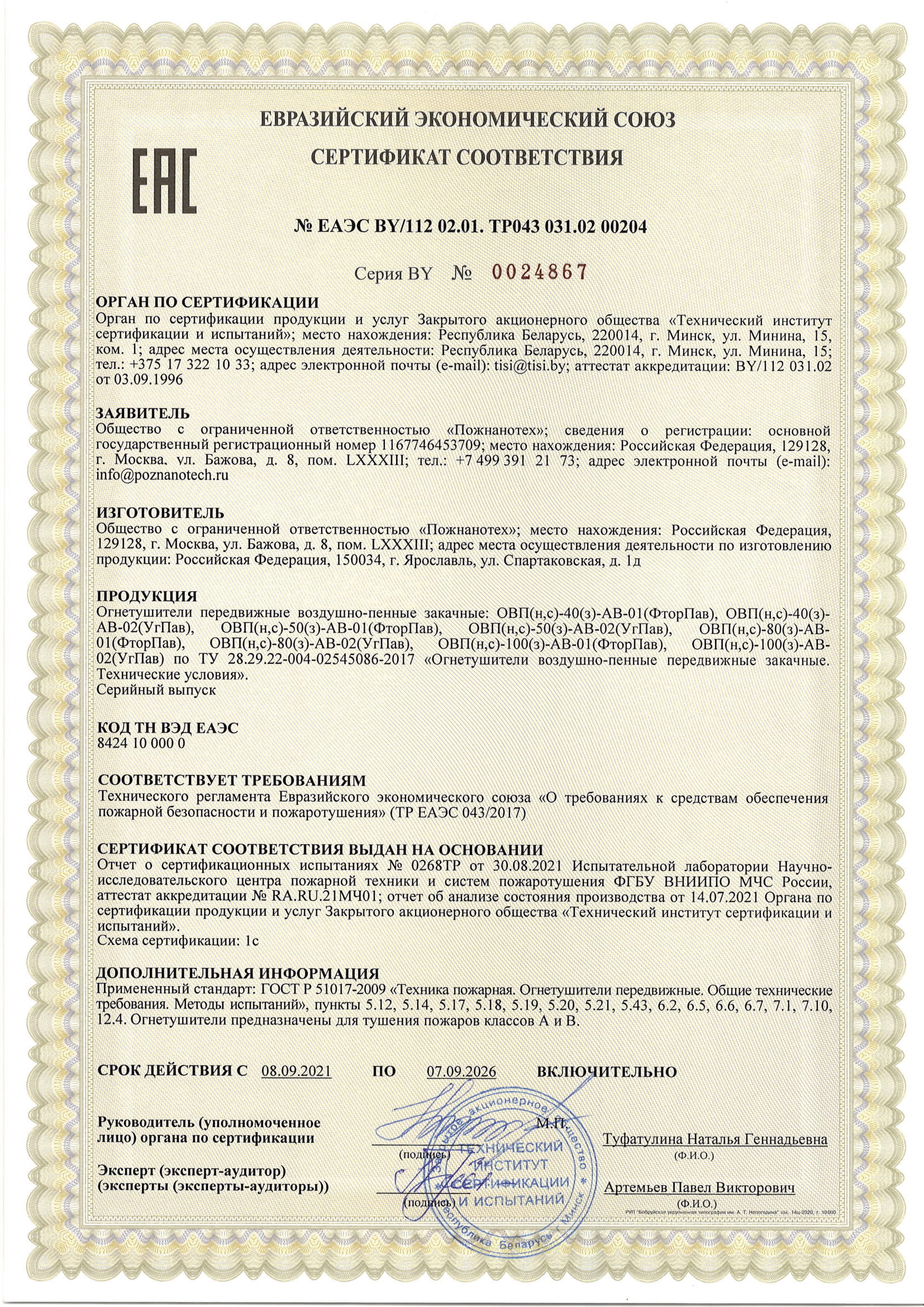 Назначенный срок службы огнетушителя: 10 лет.