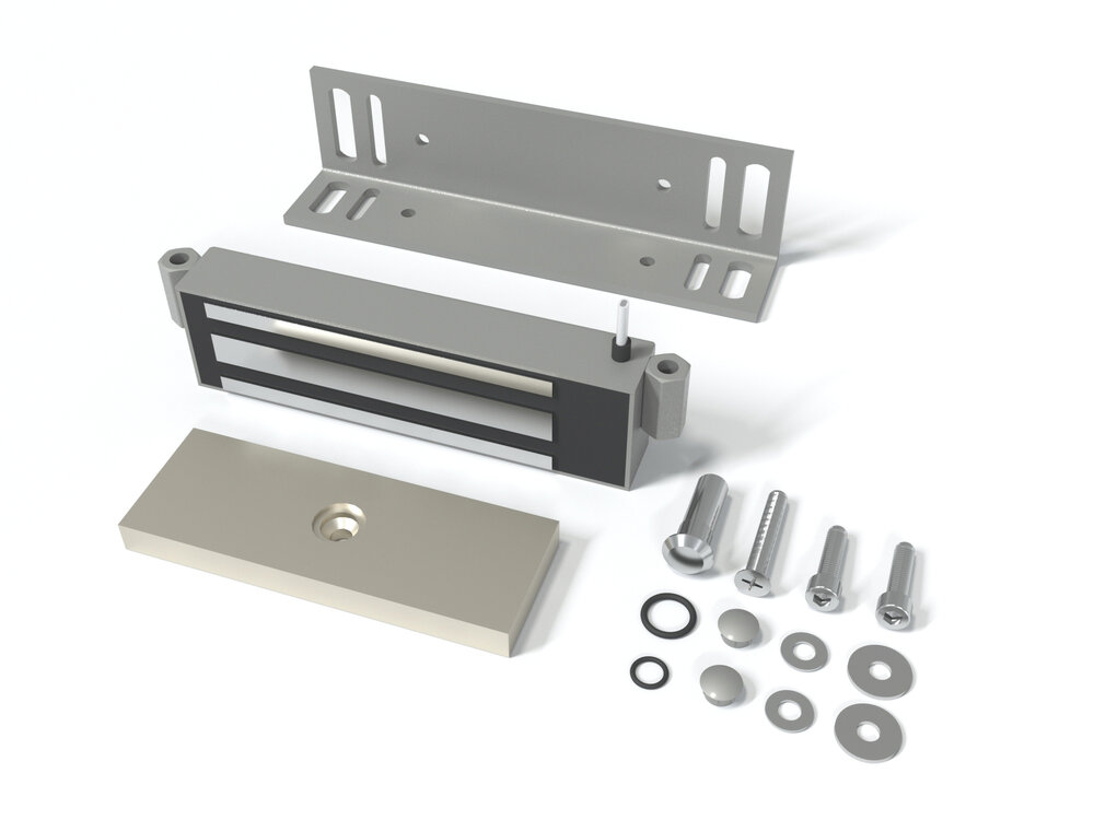 Замок электромагнитный для стальных дверей со стальной рамой, сила удержания 250кг, 9-15VDC, 0,6А, 7,2 Вт, встроенный модуль перемагничивания, монтажный комплект, уголок 40х50х4мм. Корпус из стали.