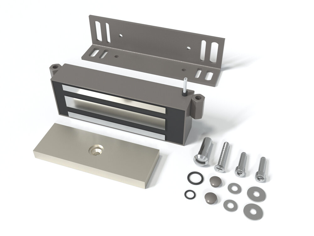 Замок электромагнитный для стальных дверей со стальной рамой, сила удержания 300кг, 9-15VDC, 0,6А, 7,2 Вт, встроенный модуль перемагничивания, монтажный комплект, уголок 40х50х4мм. Корпус из стали.