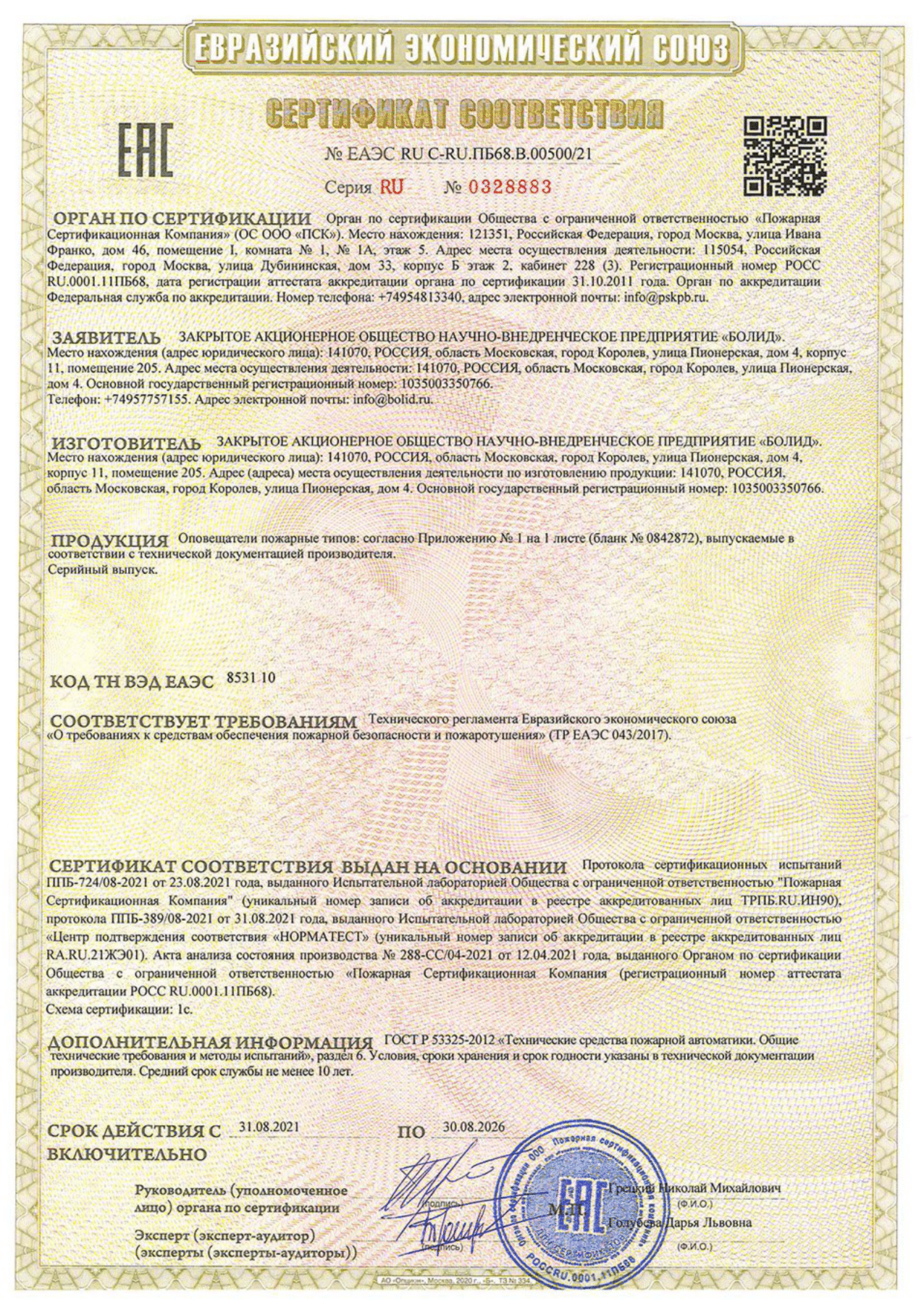 Оповещатель предназначен для эксплуатации в условиях воздействия атмосферных осадков и пыли