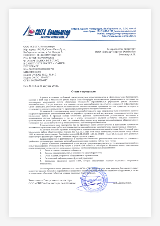 ООО «СВЕГА-Компьютер» — подрядчик в проекте по устройству систем видеонаблюдения в образовательных учреждениях Московского района города Санкт-Петербурга. На начальных этапах компания разрабатывала проектно-сметную документацию, в дальнейшем выполняла строительно-монтажные и пусконаладочные работы по разработанным проектам.